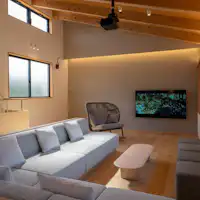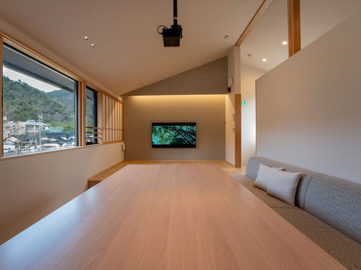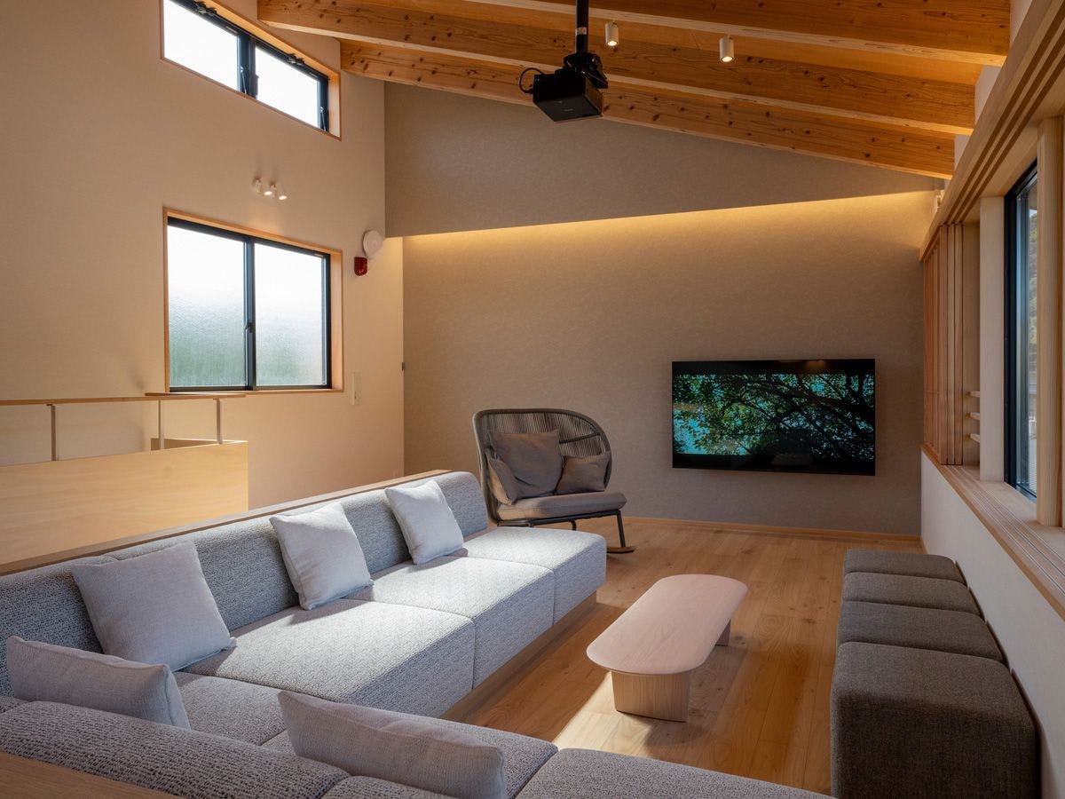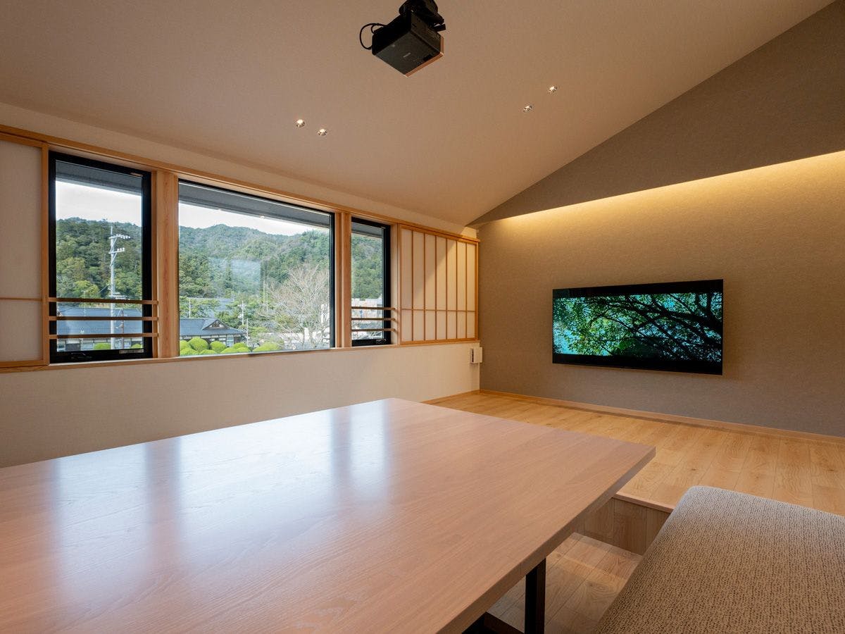 ห้องพักนั่งเล่นชั้นสองสว่างไสวด้วยหน้าต่างที่เต็มผนังและมีบรรยากาศที่โปร่งโล่งด้วยเพดานสูง จากหน้าต่างขนาดใหญ่สามารถมองเห็นภูเขายาคุโมะซึ่งถือเป็นสิ่งศักดิ์สิทธิ์ของศาลเจ้าอิซุโมะไทชะได้จากทุกห้องพัก นอกจากนี้ยังมีหน้าจอขนาดใหญ่ 120 นิ้วและโปรเจคเตอร์ครบครัน เพลิดเพลินกับช่วงเวลาผ่อนคลายและการรวมตัวในห้องพักนั่งเล่นที่กว้างขวาง