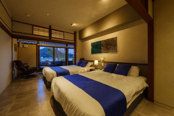 เพลิดเพลินกับทัศนียภาพอันงดงามของช่องแคบคัมมงในแบบพาโนรามา! จากยุคไทโชถึงเรวะ สัมผัสความเป็นญี่ปุ่นโมเดิร์นที่ผสมผสานระหว่างอดีตและปัจจุบันในบรรยากาศที่ชวนให้คิดถึง เราขอนำเสนอประสบการณ์การเข้าพักในที่พักที่เต็มไปด้วยความทรงจำ โดยการฟื้นฟูบ้านโบราณที่มีอายุกว่าร้อยปีให้กลับมามีชีวิตอีกครั้ง ในช่วงกลางวันคุณสามารถผ่อนคลายบนระเบียงพร้อมสัมผัสสายลมจากช่องแคบคัมมง และในยามค่ำคืนเพลิดเพลินกับวิวสะพานคัมมงที่ประดับไฟจากอ่างอาบน้ำในห้องพัก ห้องพักสองห้อง "รุริ" และ "อาโอ" ที่มองเห็นสีสันของท้องทะเล มอบความงดงามของสถาปัตยกรรมญี่ปุ่นแบบดั้งเดิมและทัศนียภาพอันยิ่งใหญ่ของช่องแคบคัมมงที่อยู่ตรงหน้า นอกจากนี้ยังอยู่ใกล้กับใจกลางเมืองชิโมโนเซกิ ที่ซึ่งทะเลญี่ปุ่นและทะเลเซโตะในมาบรรจบกัน ที่ตลาดคาราโตะมีร้านอาหารทะเลทั้งแบบญี่ปุ่นและตะวันตกเรียงราย คุณสามารถลิ้มรสอาหารทะเลสดใหม่ได้อย่างเต็มที่
