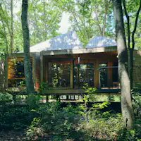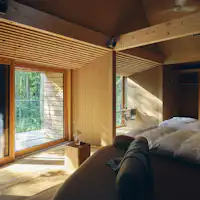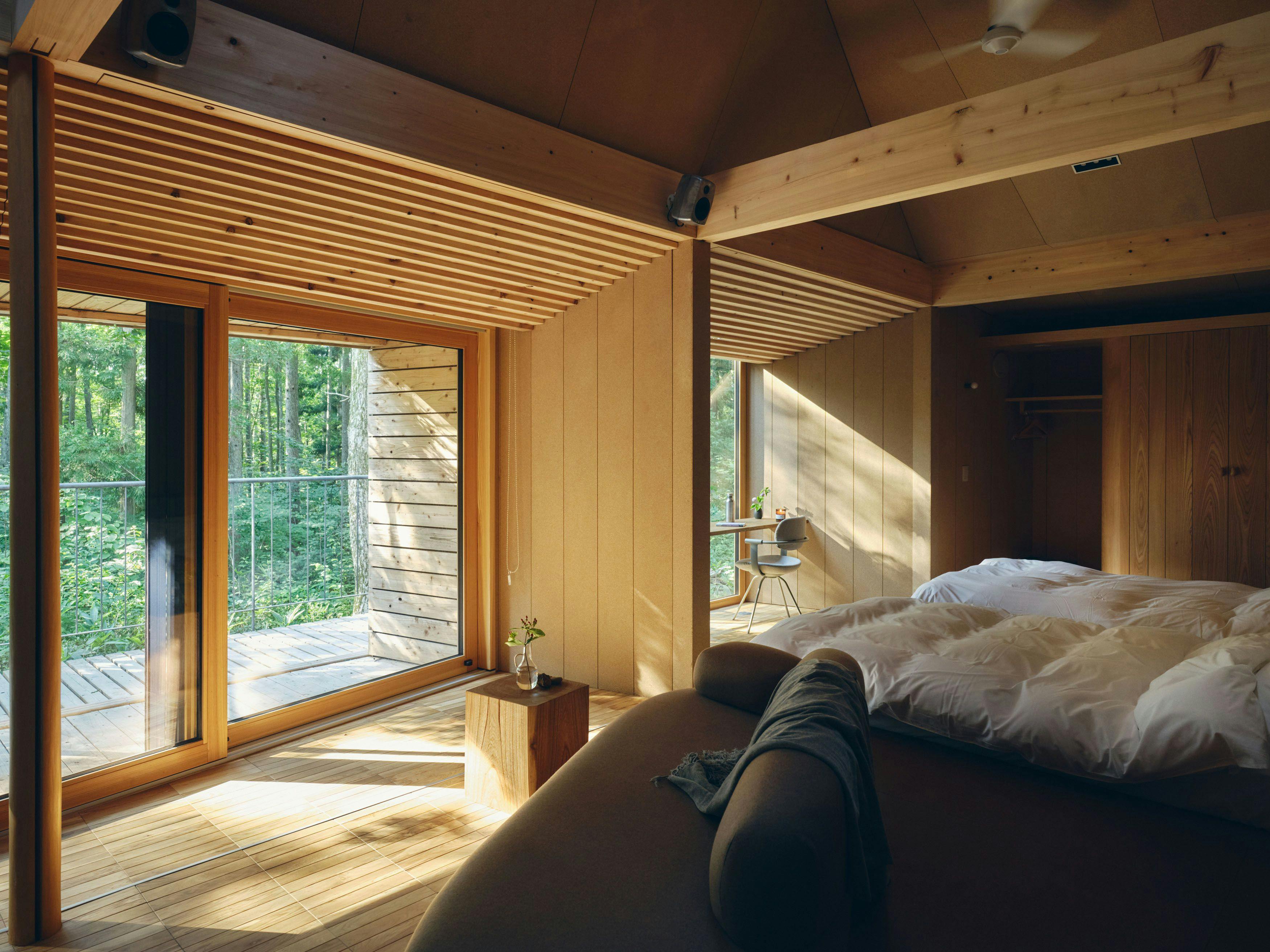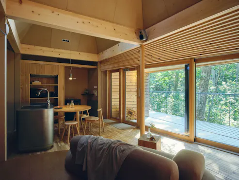 ด้วยการผสานพื้นที่นั่งเล่นและระเบียงให้เป็นหนึ่งเดียว สถาปัตยกรรมแบบแยกอาคารนี้เชื่อมโยงการใช้ชีวิตกับธรรมชาติได้อย่างไร้รอยต่อ เป็นเคบินที่สะท้อนความใส่ใจต่อพืชและสัตว์ในป่ามอส และความรักต่อโลกใบนี้ พื้นที่ทำงานโปร่งโล่ง และครัว–ห้องรับประทานอาหารแบบเคาน์เตอร์หันหน้าเข้าหากันที่ช่วยให้บทสนทนาไหลลื่น มอบพื้นที่อยู่อาศัยที่สะดวกสบายและครบครัน ให้คุณมี “บ้านหลังที่สอง” ที่ต่อเนื่องจากชีวิตประจำวัน ช่องแสงบนหลังคาที่ปล่อยให้แสงส่องลงมา และการออกแบบที่ไม่ว่าคุณจะอยู่มุมไหนของห้องพักก็สามารถมองเห็นวิวธรรมชาตินอกหน้าต่างได้ ช่วยเชื่อมโยงภายในกับภายนอกของเคบิน ให้คุณใช้ชีวิตร่วมกับธรรมชาติได้อย่างแท้จริง