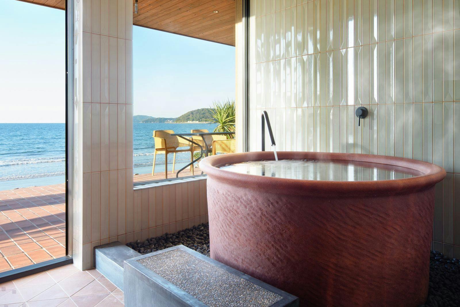 วิลล่าที่โดดเด่นด้วยน้ำพุร้อนเรดอนเพื่อการบำบัดแบบไหลผ่านจากแหล่งกำเนิดเพียงแห่งเดียวในอิโตชิมะ และวิวทะเลแบบโอเชียนวิวที่ทอดยาวอยู่ตรงหน้า