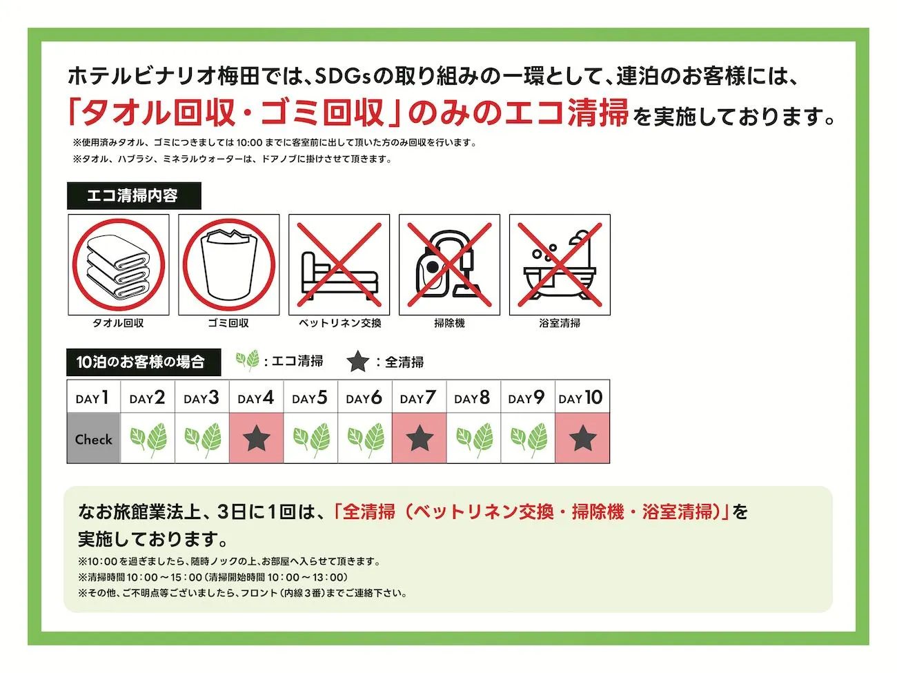 ทางโรงแรมบีนาริโอ อุเมดะ ได้เปลี่ยนการทำความสะอาดห้องพักระหว่างการเข้าพักเป็นการทำความสะอาดแบบรักษ์โลก เพื่อสนับสนุนเป้าหมาย SDGs