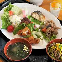 บุฟเฟ่ต์อาหารญี่ปุ่นและตะวันตกที่ล็อบบี้ชั้น 1 ราคา 1,100 เยน (รวมภาษี) (เวลา 7:00 น. - 9:30 น.) สำหรับเด็กเล็กให้บริการฟรี สามารถซื้อบัตรอาหารเช้าได้ที่แผนกต้อนรับ กรุณาแจ้งในขณะเช็คอิน ทั้งนี้ สามารถซื้อบัตรในวันเดียวกันได้เช่นกัน