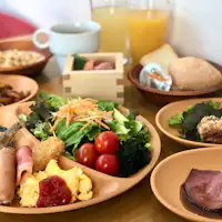 บุฟเฟต์อาหารญี่ปุ่นและตะวันตก เวลาให้บริการ: 7:00–10:00 (สั่งได้ถึง 9:30) สถานที่: ร้านอาหารชั้น 1 “วะโชกุ นิชิยามะ” ราคา: ซื้อล่วงหน้า 2,000 เยน