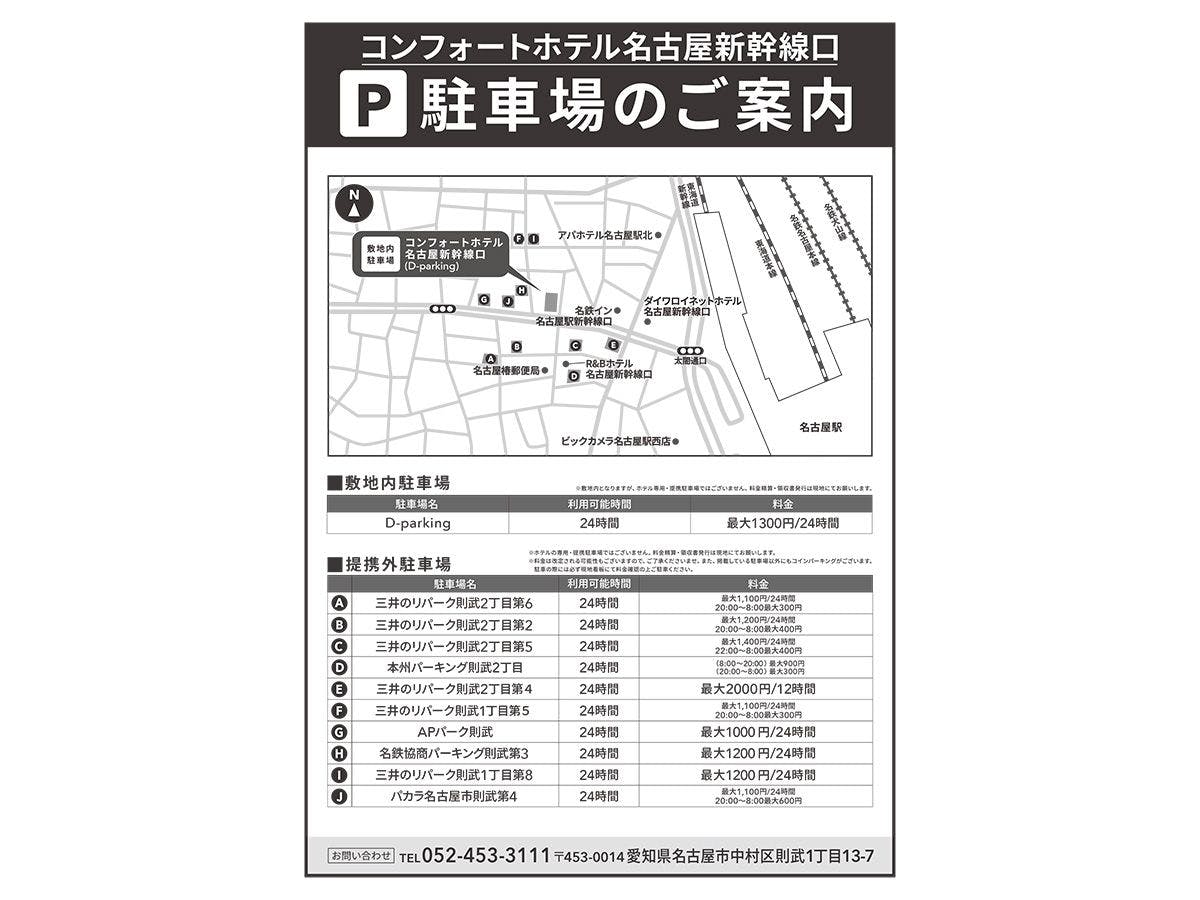 ※ด้านหลังโรงแรมมี "D-พาร์กิ้ง" แต่ไม่ได้เป็นที่จอดรถที่โรงแรมร่วมมือกัน ค่าจอดจะถูกคิดตามอัตราที่กำหนด