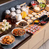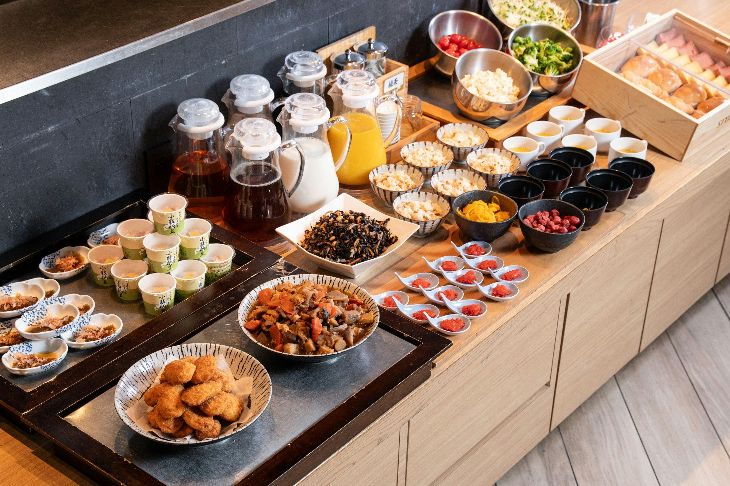บุฟเฟ่ต์เน้นอาหารญี่ปุ่น สถานที่: ชั้น 1 "Kyushu Megumi no Kozuchi" เวลาอาหารเช้า: 7:00~10:00 (รับออเดอร์สุดท้าย: 10:00) ราคา: ผู้ใหญ่ 1,300 เยน (รวมภาษี), นักเรียนประถม 700 เยน (รวมภาษี), เด็กก่อนวัยเรียนฟรี ※ หากชำระเงินโดยตรงที่ร้านอาหาร ราคาสำหรับผู้ใหญ่คือ 1,500 เยน (รวมภาษี), นักเรียนประถม 700 เยน (รวมภาษี), และเด็กก่อนวัยเรียนฟรี