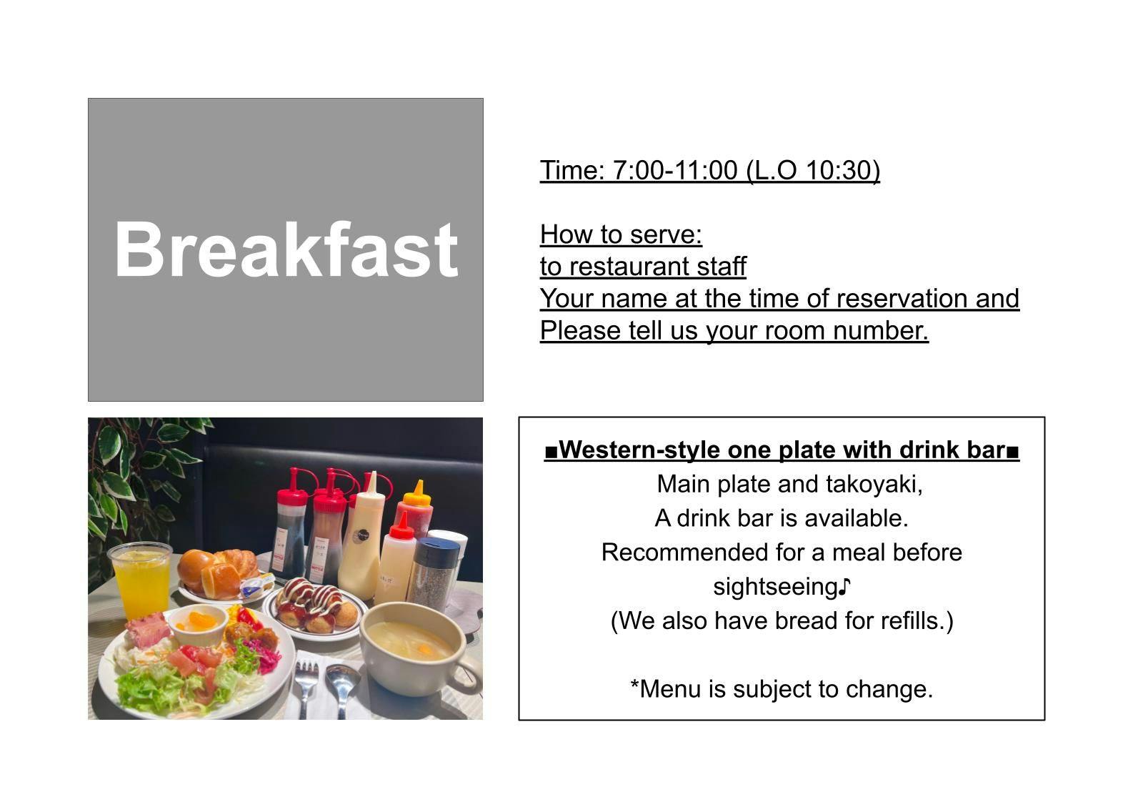 | อาหารเช้า | 【ไอดอลโฮเทล】 ■ อาหารเช้า (เวลาให้บริการ 7:00-10:30 รับออเดอร์สุดท้าย) เซ็ตอาหารเช้าสไตล์ตะวันตก {รวมเครื่องดื่มรีฟิล} เสิร์ฟเมนูหลักแบบจานเดียวพร้อมเครื่องดื่มรีฟิล เหมาะสำหรับมื้อเช้าก่อนออกไปเที่ยว♪ (มีขนมปังสำรองเตรียมไว้ให้ด้วย) ※ เมนูอาจมีการเปลี่ยนแปลง |