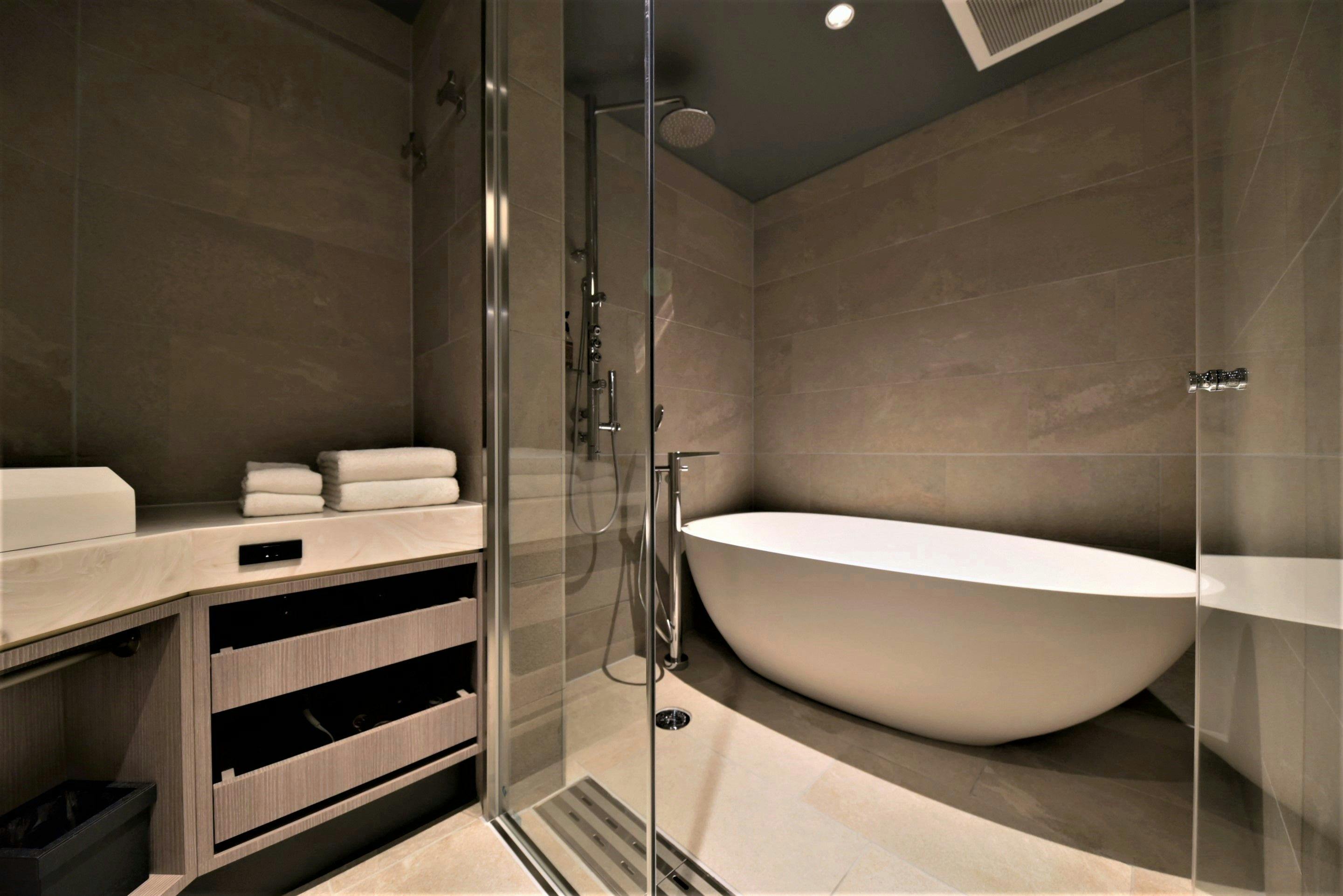 Accommodation for the Expo. The lobby features a soda bar where you can always enjoy sparkling drinks, which is delightful. Coffee is available in your room. Although the use of the body shower was a bit unclear, the shower is from ReFa, and the hairdryer has a low-temperature drying function that leaves your hair shiny. The power supply under the sofa is convenient.