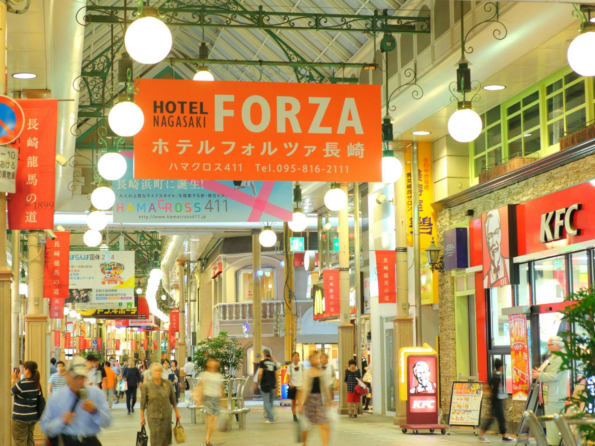 ย่านการค้าฮามะมาจิอาเขตในนางาซากิ โรงแรมฟอร์ซ่านางาซากิตั้งอยู่ตั้งแต่ชั้น 4 ขึ้นไปของ HAMACROSS411 ซึ่งเป็นศูนย์กลางของย่านนี้ เนื่องจากอยู่ภายในอาเขต คุณสามารถช้อปปิ้งและรับประทานอาหารได้โดยไม่เปียกฝนในวันที่ฝนตก