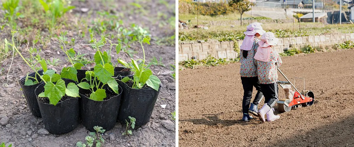 อย่างแรกคือประสบการณ์เกษตรกรรมปลูกกล้าผักและหว่านเมล็ด ในฤดูใบไม้ผลิเราตั้งใจเน้นที่ “การปลูก” มากกว่า “การเก็บเกี่ยว” เพื่อให้คุณได้สัมผัสว่าผักเริ่มเติบโตอย่างไรผ่านการลงมือจับดินจริง อีกทั้งสามารถนำกล้าที่ปลูกเองกลับบ้านได้ เช่น โหระพาและร็อกเก็ต (อารูกูลา)