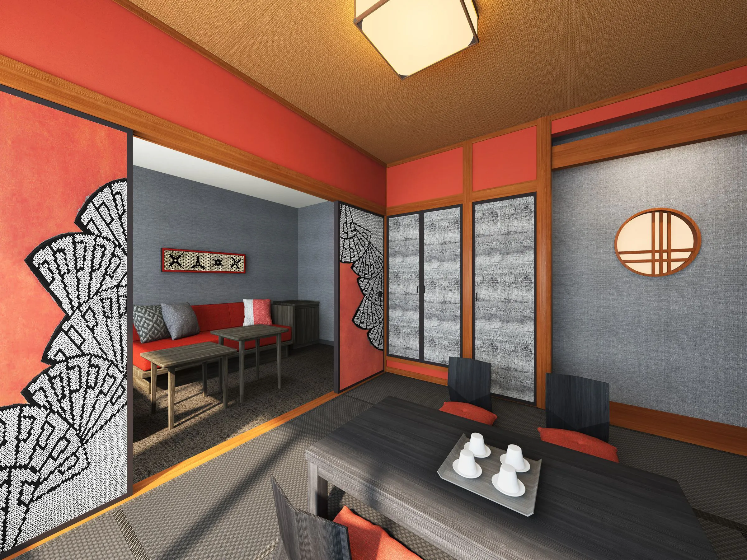 ตกแต่งอย่างมีสไตล์ด้วยโทนสี “แดง” ที่ได้แรงบันดาลใจจากคุมาโมโตะ “ดินแดนแห่งไฟ” ผสมกับโทน “ดำ・เทา” ที่สื่อถึงนินจา เป็นพื้นที่สนุกสนานชวนเล่นที่เด็กๆ ก็ต้องชื่นชอบ