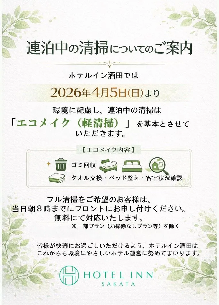 【สำคัญ】ประกาศเริ่มใช้บริการทำความสะอาดห้องพักระหว่างการเข้าพักหลายคืน (Eco Make) (เริ่มตั้งแต่วันที่ 5 เมษายน 2026)