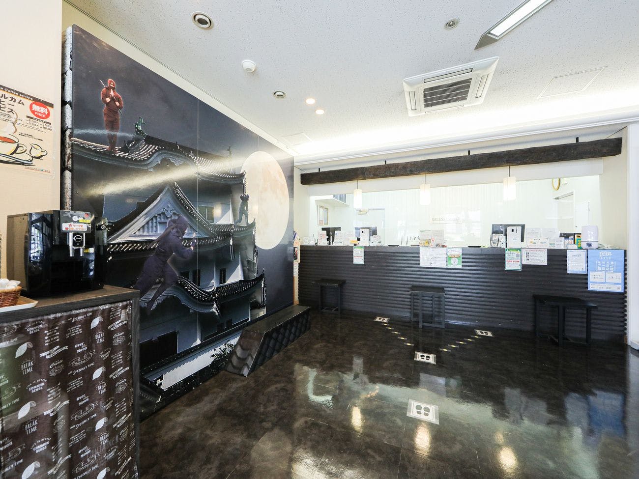 แผนกต้อนรับเปิดให้บริการตลอด 24 ชั่วโมง คุณจึงมั่นใจได้แม้จะมาถึงในเวลาดึก พนักงานของเราพร้อมต้อนรับคุณด้วยรอยยิ้ม นอกจากนี้ ในบริเวณล็อบบี้ยังมีการจัดแสดงและจำหน่ายสินค้าท้องถิ่น เช่น เครื่องปั้นดินเผาอิกะ และสาเกญี่ปุ่น