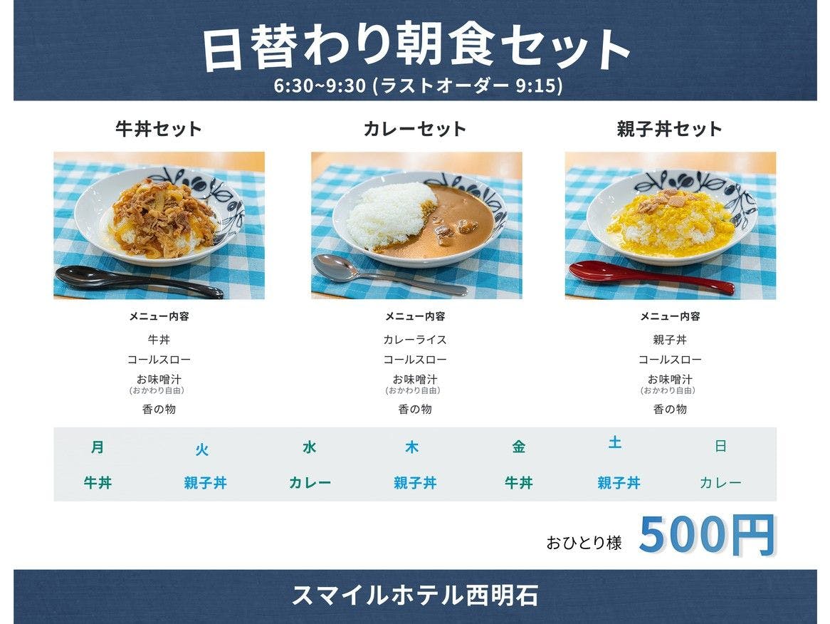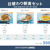 | อาหารเช้า | 【เวลาเปิดทำการ】6:30 - 9:30 (เข้าครั้งสุดท้าย 9:15) 【เมนู】ข้าวหน้าต่างๆ เปลี่ยนทุกวัน, ผักดอง, สลัด เครื่องดื่มฟรี (กาแฟ, น้ำผลไม้, ชา, ซุป 3 ชนิด) - วันอาทิตย์: ข้าวหน้าไก่และไข่ - วันจันทร์: ข้าวหน้าจีน - วันอังคาร: ข้าวหน้าเนื้อ - วันพุธ: แกงกะหรี่ - วันพฤหัสบดี: ข้าวหน้าไก่และไข่ - วันศุกร์: ข้าวหน้าเนื้อ - วันเสาร์: แกงกะหรี่ ※เมนูอาจมีการเปลี่ยนแปลงตามสถานการณ์การจัดซื้อวัตถุดิบ |