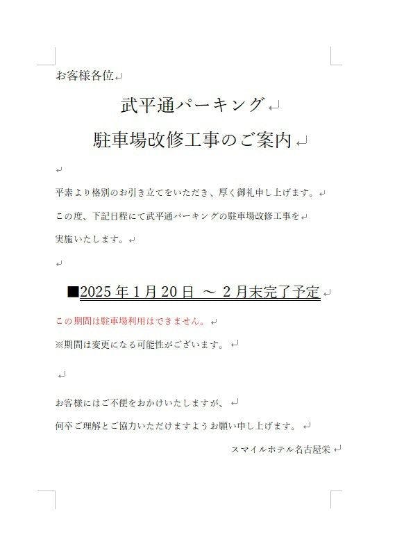 ・ค่าใช้จ่าย: ค่าจอดรถสำหรับผู้เข้าพักต่อคืน ¥1,500 ・เวลาจอดรถ: 15:00 ถึง 11:00 ของวันถัดไป (หลังจากนั้น 100 เยนต่อชั่วโมง) ・ที่จอดรถ: ความยาวรถ --- ความกว้างของรถ --- ความสูงของรถ --- ・จำนวนที่จอดรถ: 4คัน ・บริการรับจอดรถ: ไม่มี 【สำหรับลูกค้าที่เดินทางมาด้วยรถยนต์】 กรุณาใช้บริการที่จอดรถที่เป็นพันธมิตรทั้ง 4 แห่งด้านล่างนี้ หลังจากจอดรถแล้ว กรุณาแจ้งพนักงานต้อนรับว่าท่านใช้บริการที่จอดรถแห่งใด ■ เมเท็ตสึ เคียวโช พาร์คกิ้ง โรงแรม正面 สามารถจอดได้ 5 คัน・กลางแจ้ง・ไม่มีข้อจำกัดความสูง ค่าบริการ: 15:00 น. - 11:00 น. ของวันถัดไป 1,500 เยน ที่อยู่: 4-10-5 ซาคาเอะ นาคะ-คุ นาโกย่า ไอจิ ■ บุเฮโดริ พาร์คกิ้ง สามารถจอดได้ 122 คัน・ที่จอดรถแบบอาคาร・ความสูงไม่เกิน 2.1 เมตร ค่าบริการ: จอดรถ - 24 ชั่วโมง 1,200 เยน ที่อยู่: 4-14-10 ซาคาเอะ นาคะ-คุ นาโกย่า ■ เซ็นทรัล พาร์คกิ้ง สามารถจอดได้ 101 คัน・ที่จอดรถแบบอาคาร・ความสูงไม่เกิน 2.1 เมตร ค่าบริการ: จอดรถ - 24 ชั่วโมง 1,350 เยน ที่อยู่: 4-15-6 ซาคาเอะ นาคะ-คุ นาโกย่า ■ เมเท็ตสึ เคียวโช พาร์คกิ้ง สุยโฮเอ็น สามารถจอดได้ 126 คัน・ที่จอดรถกลางแจ้ง・ความสูงไม่เกิน 2.3 เมตร ค่าบริการ: 15:00 น. - 11:00 น. ของวันถัดไป 1,500 เยน ที่อยู่: 4-1 ซาคาเอะ นาคะ-คุ นาโกย่า