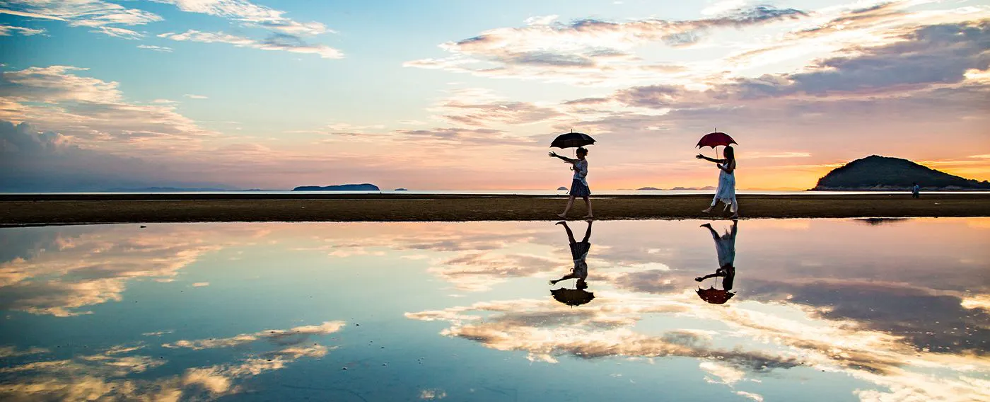 ชายหาดที่มีชื่อเสียงว่าเป็นทะเลสาบเกลืออูยูนีของญี่ปุ่น ในช่วงไม่กี่ปีที่ผ่านมาได้รับความสนใจในฐานะจุดถ่ายรูปที่สวยงาม ลองถ่ายภาพเงาสะท้อนบนผิวน้ำที่เหมือนกระจกในช่วงพระอาทิตย์ตกและน้ำขึ้นน้ำลงดูไหม?