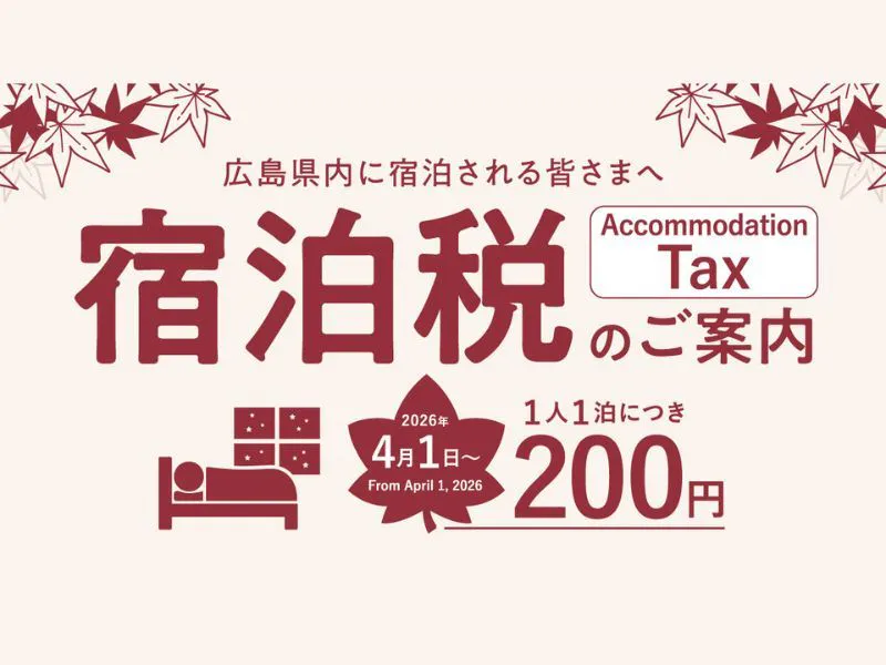 ตั้งแต่วันที่ 1 เมษายน 2026 เป็นต้นไป จังหวัดฮิโรชิมะได้แจ้งให้ทราบถึงการเริ่มเก็บภาษีที่พักตามข้อบังคับ โดยมีรายละเอียดดังนี้: