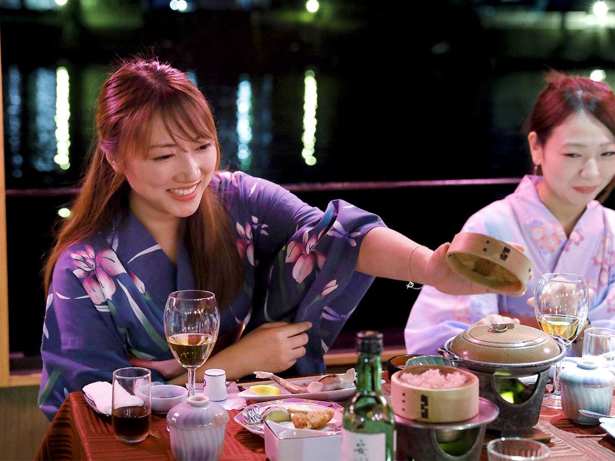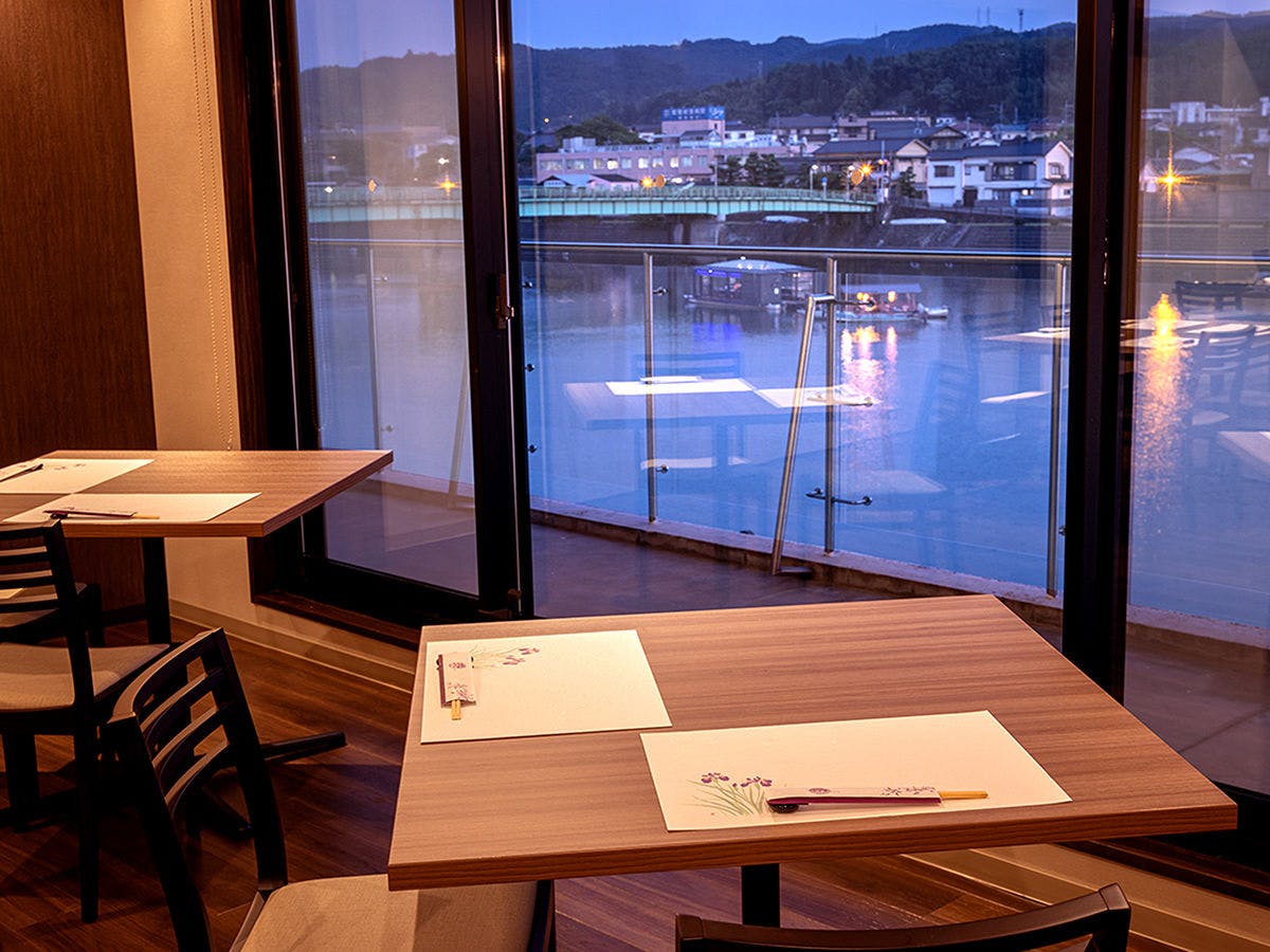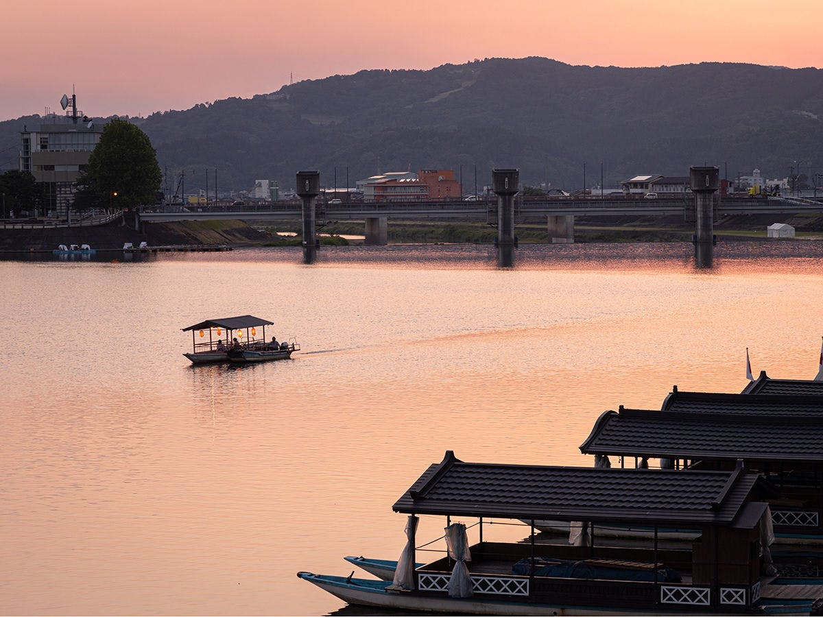 ยามเช้าแสงอาทิตย์สะท้อนบนผิวน้ำของแม่น้ำอย่างอ่อนโยน และยามค่ำคืนเรือยากาตะที่ประดับไฟและทิวทัศน์เมืองฮิตะจะปรากฏให้เห็นทั่วบริเวณ เพลิดเพลินกับช่วงเวลาแห่งการผ่อนคลายด้วยเสียงน้ำไหลและวิวทิวทัศน์ที่งดงาม