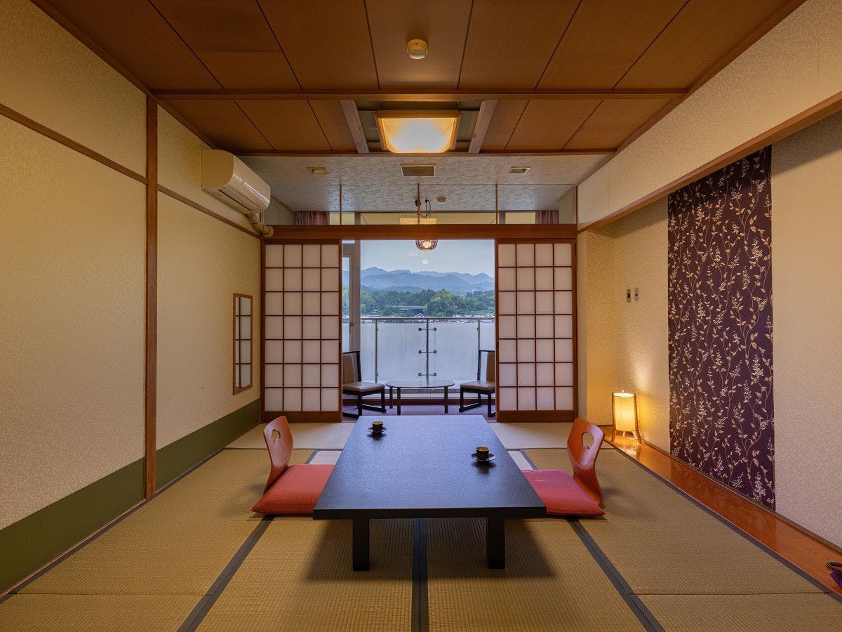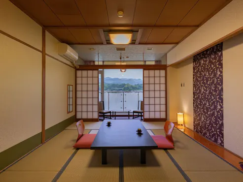 ห้องพักและอ่างอาบน้ำกลางแจ้งพร้อมวิวที่สวยงามของ "แม่น้ำมิคุมะ" เพลิดเพลินกับอาหารไคเซกิที่ใช้วัตถุดิบตามฤดูกาลจากโออิตะ และสัมผัสสายลมเย็นในอ่างอาบน้ำกลางแจ้ง
