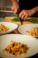 ออแบร์จ คือร้านอาหารที่มีที่พัก ตั้งอยู่ห่างจากตัวเมืองประมาณ 10 นาทีโดยรถยนต์จากสถานีทาคายามะ ล้อมรอบด้วยป่าไม้ ในระหว่างการเข้าพัก ท่านสามารถเพลิดเพลินกับการดื่มชาและพูดคุยกับเพื่อนหรือคนที่มาด้วยกันได้อย่างอิสระในเลานจ์ที่มีเพดานสูงหรือระเบียงชั้นหนึ่ง ในฤดูหนาว ท่านสามารถใช้เวลาอ่านหนังสือหรือทำงานในบรรยากาศที่อบอุ่นจากเตาผิงไม้ ห้องพัก มีให้เลือกสองประเภท ได้แก่ ห้องพักเตียงคู่และห้องพักเตียงเดี่ยว ไม่มีโทรทัศน์ในห้องพัก บริเวณรอบๆ เงียบสงบและเต็มไปด้วยป่าไม้และอากาศบริสุทธิ์ หลังจากรับประทานอาหารและดื่มเครื่องดื่มแล้ว ท่านสามารถพักผ่อนในชุดนอนที่นุ่มสบาย ผ้าห่มขนเป็ด และเตียงที่มีหัวเตียงทำจากไม้ฮิเมะโคมัตสึที่ช่วยให้หลับสบาย ภายในที่พัก เป็นเขตปลอดบุหรี่ทั้งหมด และมีอ่างอาบน้ำไม้ฮิโนกิแบบส่วนตัวให้บริการสองแห่ง อาหารเย็นของออแบร์จฮิดะโนะโมริ เป็นคอร์สอาหารอิตาเลียนที่จับคู่กับเครื่องดื่มที่เหมาะสม เครื่องดื่มมีหลากหลายประเภทที่เป็นธรรมชาติ และจะปรับปริมาณตามแต่ละเมนูที่เสิร์ฟ อาหารเช้า ประกอบด้วยกราโนล่าโฮมเมด ขนมปังและเมนูไข่ พร้อมน้ำผลไม้ กาแฟ และชา