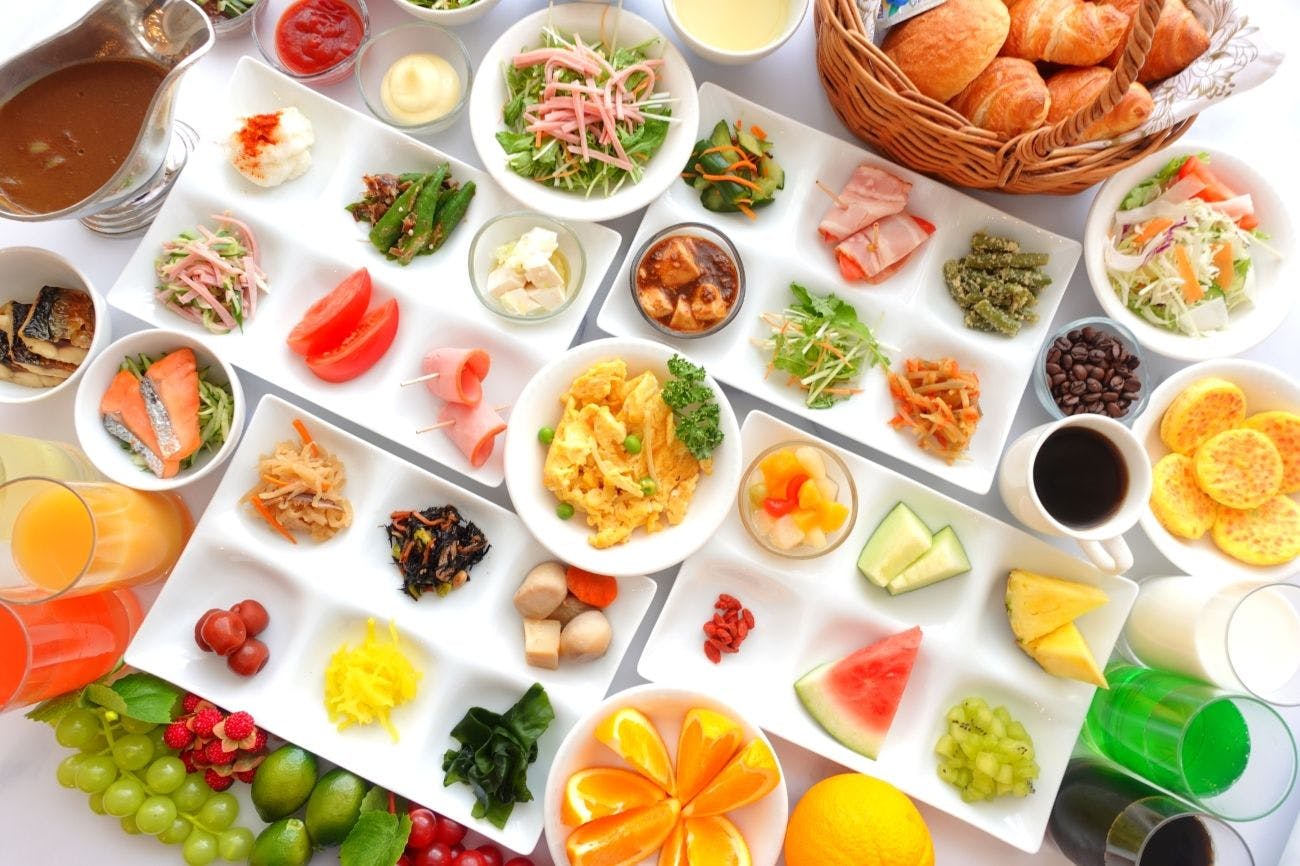 ตอนเช้ามีบุฟเฟ่ต์ญี่ปุ่นและตะวันตก ตอนกลางวันมีอาหารกลางวันเปลี่ยนเมนูทุกสัปดาห์เฉพาะวันธรรมดา และตอนเย็นมีอาหารจีน