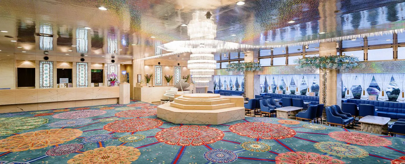 โคมไฟระย้าที่เปล่งประกายระยิบระยับ หินอ่อนที่ขัดเงาอย่างประณีต บนพื้นปูพรมที่ออกแบบเป็นรูปอัญมณีในแผ่นเดียวเต็มพื้นที่ ผ่อนคลายบนโซฟาสีเขียวอ่อนในล็อบบี้กว้างขวางและเพลิดเพลินกับช่วงเวลาแห่งความสง่างาม