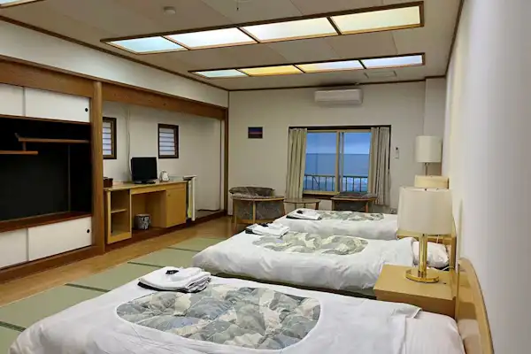 While the building and Facility show signs of age, they are well maintained through ongoing repairs and thorough cleaning. The proprietress and all staff were very friendly and attentive, making our stay comfortable. One staff member told us, “The building is old, but the location (the seaside is right in front of you!) and the baths are amazing,” and it was heartwarming to feel their love for the Ryokan. The meals may not feature luxury ingredients like those at high-end Ryokan, but for this price we were more than satisfied.