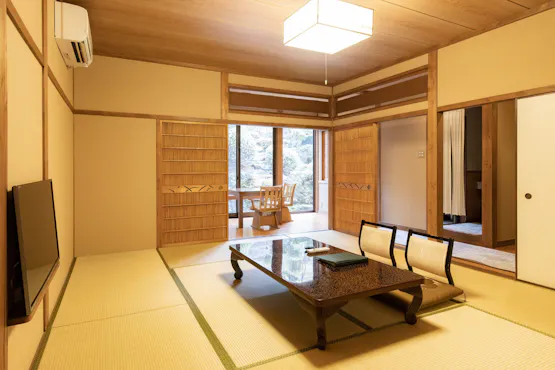 ที่พักที่มีประวัติศาสตร์ยาวนานในฐานะที่พักของนักเดินทาง มีเสน่ห์ด้วยบรรยากาศที่เงียบสงบและอาหารที่จัดเตรียมด้วยความใส่ใจ มีน้ำพุร้อนกลางแจ้งในห้องพักเพียงแห่งเดียวที่น้ำพุร้อนโดโรกาวะ ซึ่งคุณสามารถผ่อนคลายในอ่างอาบน้ำกลางแจ้งที่ทำจากไม้ฮิโนกิ นอกจากนี้ ห้องพักที่กว้างขวางยังเหมาะสำหรับครอบครัวหรือกลุ่มเพื่อน ที่ก้นอ่างอาบน้ำกลางแจ้งที่ทำจากเซรามิกมีตัวอักษร '笑' ซึ่งนำรอยยิ้มจากใจในบรรยากาศที่เงียบสงบ คุณยังสามารถเพลิดเพลินกับอาหารที่ปรุงจากวัตถุดิบจากภูเขาและแม่น้ำได้อีกด้วย