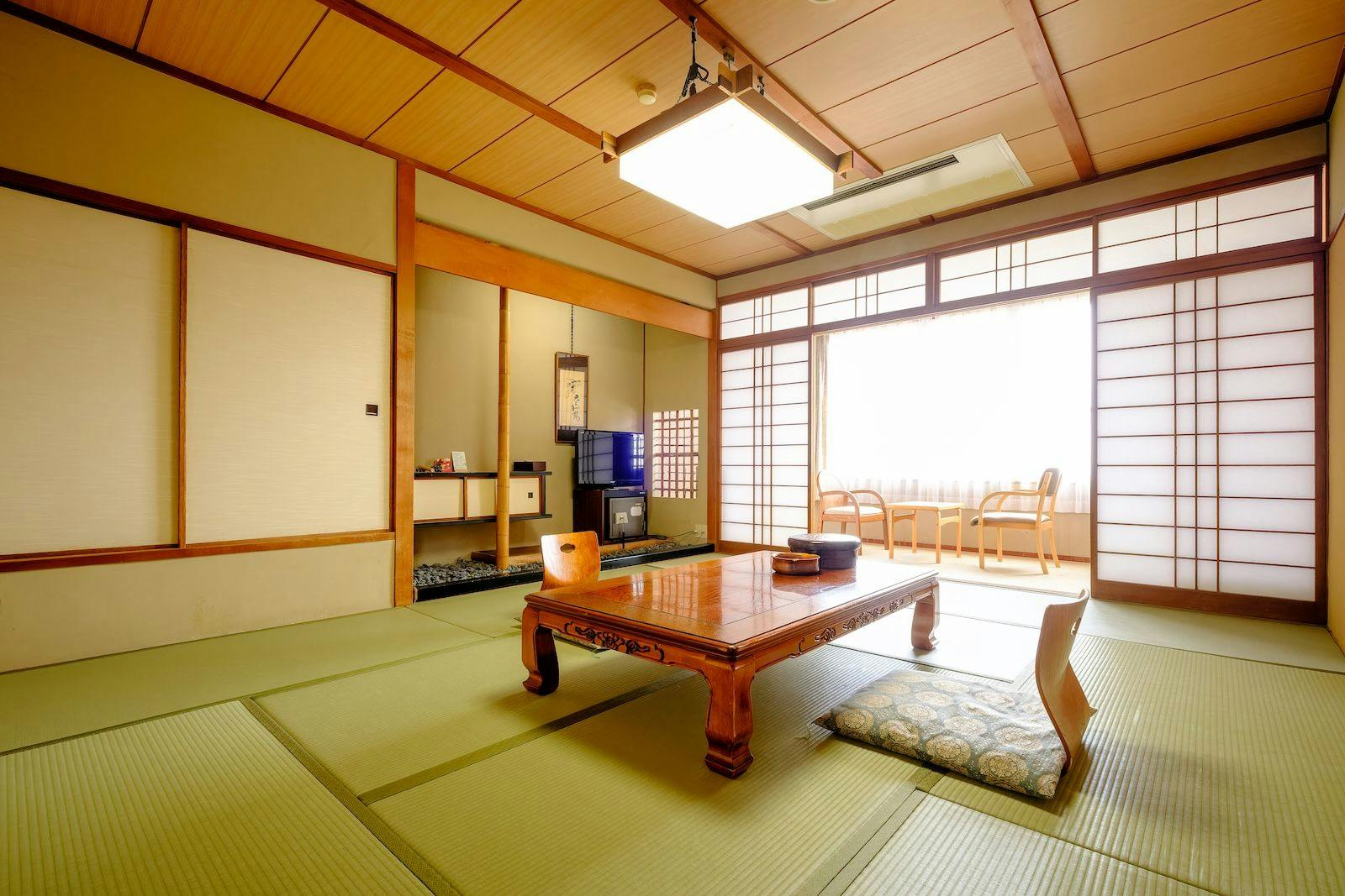 ที่พักที่มีบรรยากาศย้อนยุคที่น่าหลงใหล สามารถชมสวนญี่ปุ่นจากล็อบบี้ ห้องปลอดบุหรี่เป็นห้องสไตล์ญี่ปุ่นที่หันหน้าไปทางสวน มีเครื่องปรับอากาศ ห้องน้ำพร้อมฟังก์ชันล้าง อ่างอาบน้ำ ตู้นิรภัย และตู้เย็น ใช้น้ำพุร้อนไคเกะที่มีชื่อเสียงในเรื่องน้ำที่ดีต่อผิวพรรณ พร้อมเสิร์ฟอาหารไคเซกิที่หลากหลาย เช่น ปลาดิบสด ปู และเนื้อวัวญี่ปุ่นย่างบนแผ่นเซรามิก
