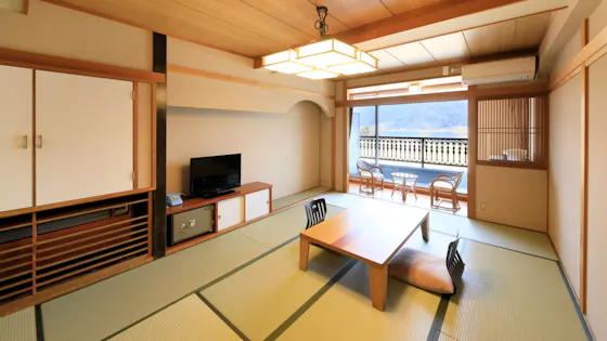 ที่พักที่ล้อมรอบด้วยภูเขาไฟฟูจิและทะเลสาบคาวากุจิ มีอ่างอาบน้ำกลางแจ้งที่มีวิวพาโนรามาเป็นที่นิยม มีห้องพักพร้อมอ่างอาบน้ำกลางแจ้งสุดหรูและห้องสำหรับเด็กที่เหมาะสำหรับการใช้งานหลากหลาย การแช่น้ำพุร้อนพร้อมชมวิวภูเขาไฟฟูจิและทะเลสาบคาวากุจิช่วยผ่อนคลายความเหนื่อยล้าจากชีวิตประจำวัน มีสิ่งอำนวยความสะดวกอ่างอาบน้ำขนาดใหญ่พร้อมจากุซซี่ ฝักบัวอเนกประสงค์ อ่างอาบน้ำกลางแจ้งขนาดใหญ่ และซาวน่า อาหารเย็นเป็นชุดอาหารญี่ปุ่น และอาหารเช้าเป็นเมนูชุดอาหารญี่ปุ่น