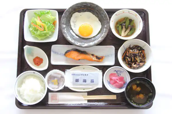 | อาหารเช้า | ชุดอาหารญี่ปุ่นพร้อมข้าวโคชิฮิคาริจากอุโอนุมะ 1,100 เยน |