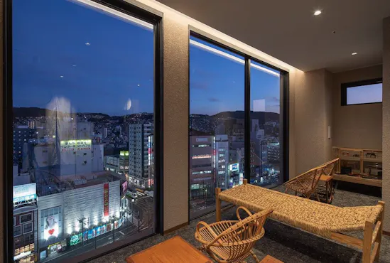 สถานีรถรางที่ใกล้ที่สุด "นิชิฮามะมาจิ" เดินเพียง 2 นาที, ป้ายรถบัสสนามบิน "ชูโอโอบาชิ" เดินเพียง 1 นาที, โรงแรมธุรกิจที่เปิดในปี 2019 บริการฟรีครบครัน ชั้นบนสุดมีอ่างอาบน้ำในร่มและอ่างอาบน้ำกลางแจ้ง เปิดให้บริการถึงตี 2 ทำให้คุณสามารถผ่อนคลายได้แม้ในวันที่กลับดึก คาเฟ่เครื่องดื่มฟรีมีบริการกาแฟร้อนบดสดใหม่และชานางาซากิซะโนะงิแช่เย็น พร้อมด้วยบริการซักผ้าด้วยตัวเองฟรีตลอด 24 ชั่วโมง ห้องพักออกแบบในสไตล์มินิมอลโดยใช้สีน้ำตาลเป็นหลัก สามารถเชื่อมต่อ HDMI กับทีวีเพื่อทำงานหรือเล่นเกมบนหน้าจอขนาดใหญ่ได้ การเช็คเอาท์สามารถทำได้อย่างราบรื่นผ่านกล่องเช็คเอาท์