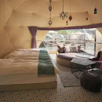 Since it was right after a severe cold wave, we went glamping with snow still on the ground. After checking in at 2:00 PM, we enjoyed board games and darts at the Woodman Lounge until dinner. Based on other guests’ Reviews, we ate dinner early and then headed to the illuminations (walking was tough because of the snow). After that, we went to Ruri-yu, enjoyed the hot stone sauna and Onsen, then relaxed at the Lantern Terrace reading a book. There are two toilet/washroom areas within the GRAX area (both air-conditioned), but they were a bit far from our dome (still relatively close), and it was difficult to get there because the snowy ground was slippery. At night it started raining heavily; the sound of rain kept us awake. It was also disappointing that melted snow and rainwater dripped from above near the entrance roof, so we got wet and cold every time we went in and out. After checkout, we relaxed at Ruri-yu again and then had lunch at Food Park before heading home. If the weather had been better and the ground not so slippery, we would have liked to do more—so next time I’d love to visit in a warmer season. At check-in, the staff member spoke very fast, so it would be helpful if they could speak a little more slowly. Also, I wish there were pockets in Ruri-yu’s loungewear to hold a card.