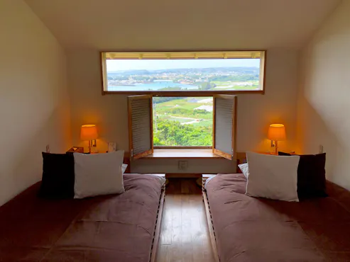 บนเนินเขาที่มองเห็นทะเลซาจิบารุ ท่ามกลางต้นไม้เขียวขจีและดอกไม้หลากสี มีที่ซ่อนตัวเล็กๆ สำหรับผู้ใหญ่ที่เงียบสงบซ่อนตัวอยู่ เมื่อปีนขึ้นไปยังป่ากาจูมารุที่อยู่หลังเขา จะพบกับเทอเรซต้นไม้ ที่สามารถสัมผัสช่วงเวลาแห่งการพักผ่อนส่วนตัวในธรรมชาติอันอุดมสมบูรณ์ได้อย่างเต็มที่ ห้องพักมี 2 ประเภท ได้แก่ "คาอิซะ [อาคารหลัก]" ซึ่งเป็นแบบเพนชั่นที่เปิดให้บริการตั้งแต่ปี 2008 สามารถสัมผัสความอบอุ่นของไม้และชมวิวทะเลและทุ่งอ้อยที่แผ่กว้างอยู่เบื้องหน้า เมื่อเปิดหน้าต่างออก ท่านจะได้สัมผัสเสียงนกร้องและสายลมอ่อนๆ พร้อมดื่มด่ำกับบรรยากาศที่แตกต่างจากชีวิตประจำวัน อีกหนึ่งห้องพักคือ "คาอิซะ [อาคารแยก]" ซึ่งเป็นแบบคอทเทจที่เปิดให้บริการในปี 2018 ห้องพักที่เต็มไปด้วยความเป็นส่วนตัวที่แตกต่างจากอาคารหลัก เป็นที่ซ่อนตัวสำหรับผู้ใหญ่ที่มีคุณภาพระดับสูง ภายในห้องพักมีครัวที่สามารถนำปลาดิบสดใหม่จากเกาะโอกุที่อยู่ใกล้เคียง หรือผักตามฤดูกาลในท้องถิ่นมาปรุงอาหาร และจัดใส่จานยาจิมุน เพื่อเปลี่ยนเป็นมื้อค่ำสุดหรูได้อย่างง่ายดาย ในสถานที่ที่เวลาผ่านไปอย่างช้าๆ แห่งนี้ ขอให้ท่านลืมความวุ่นวายในชีวิตประจำวัน และใช้เวลาอย่างผ่อนคลายได้ตามสบาย