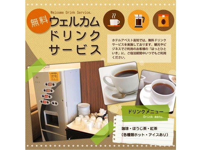 มีบริการเครื่องดื่มฟรีที่พื้นที่ว่างหน้าฟรอนต์ เช่น กาแฟ ชาเขียว น้ำมะนาว (อาจมีการเปลี่ยนแปลงตามฤดูกาล) สามารถเลือกดื่มได้ทั้งแบบร้อนและเย็นตามความชอบ บริการฟรีตลอดเวลาที่เข้าพัก เพื่อให้คุณได้ผ่อนคลายและพักผ่อนอย่างเต็มที่