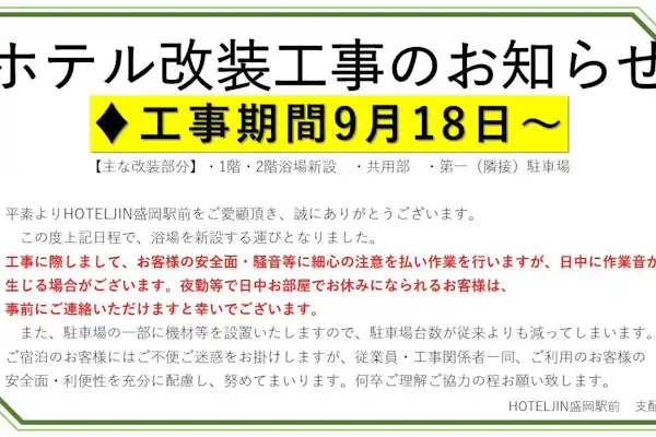※ตั้งแต่วันที่ 2026.3.1 เป็นต้นไป ชื่อโรงแรมได้เปลี่ยนจาก “HOTELJIN Morioka Ekimae” เป็น “โรงแรม Global View Morioka” โปรดทราบสำหรับผู้ที่ใช้ระบบนำทางรถยนต์ (คาร์นาวี) เป็นต้น