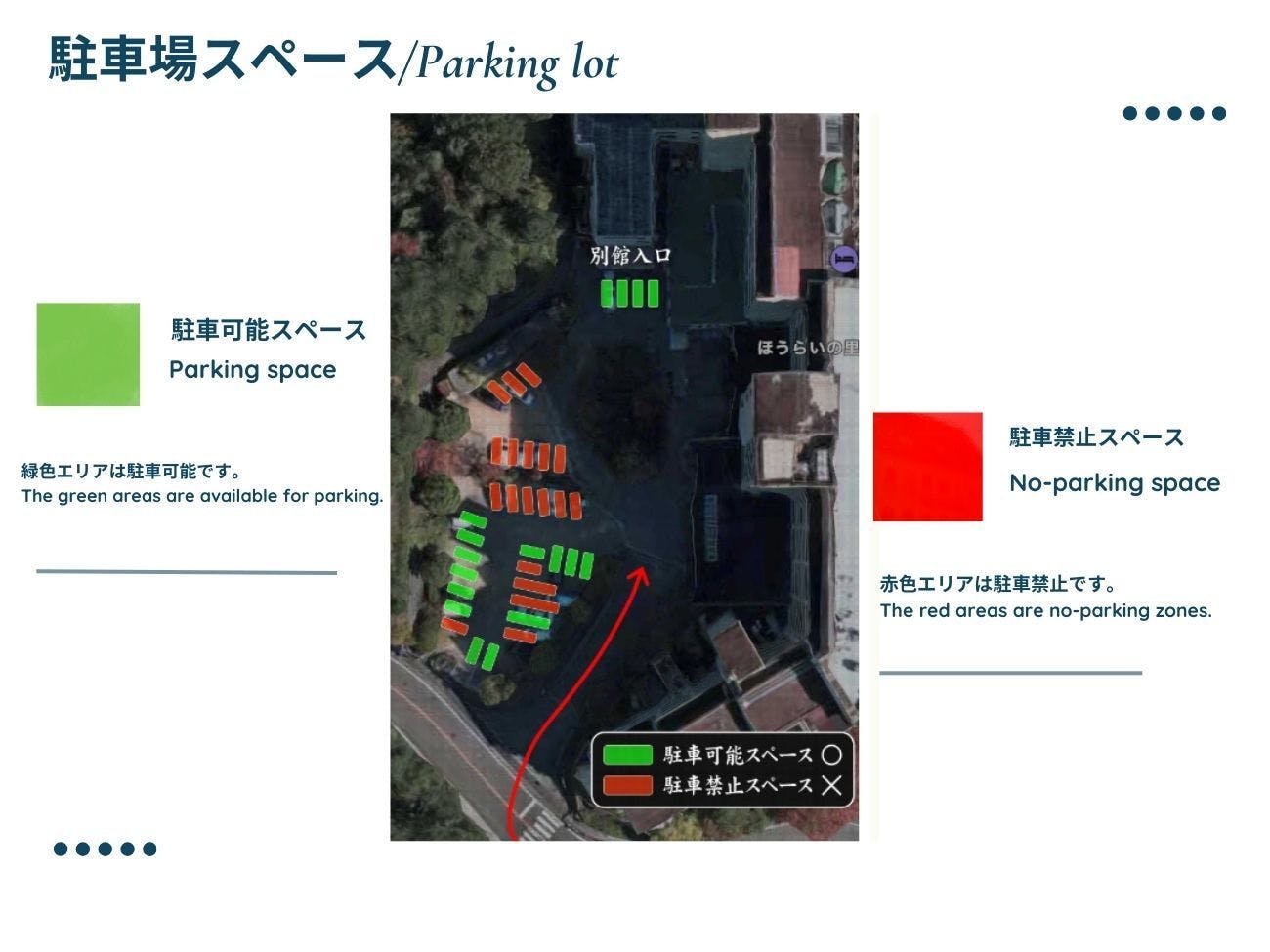 ・ค่าใช้จ่าย: ฟรีสำหรับผู้เข้าพัก ・ที่จอดรถ: ความยาวรถ --- ความกว้างของรถ --- ความสูงของรถ --- ・จำนวนที่จอดรถ: 30คัน ・บริการรับจอดรถ: ไม่มี ลูกค้าที่พักที่【อาคารเสริม】กรุณาจอดรถใน【พื้นที่เสียค่าบริการ】 ※เฉพาะอาคารหลักเท่านั้นที่สามารถจอดรถบัสท่องเที่ยวได้ ค่าจอดรถบัสคือ 1,100 เยน