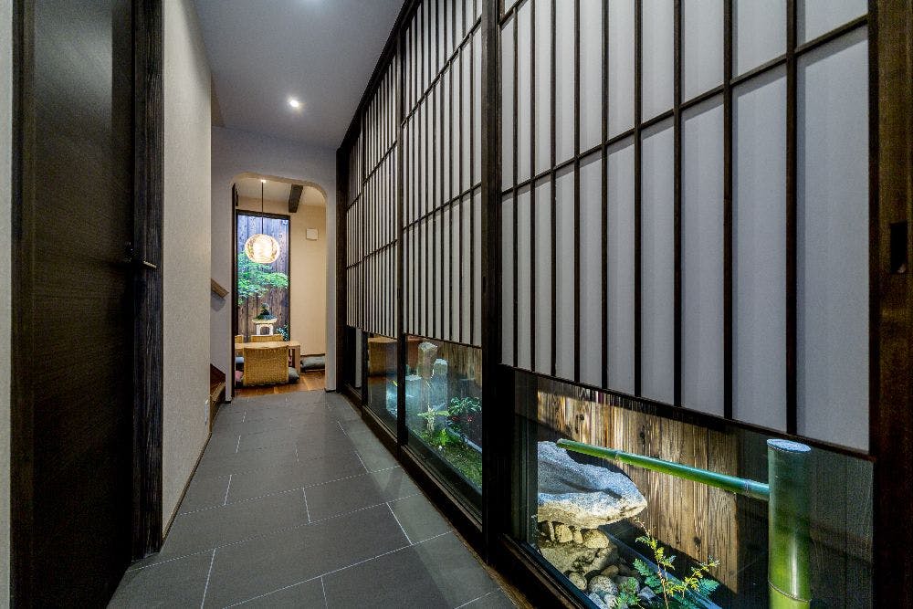 ห้องนั่งเล่นชั้น 1 มีแสงไฟอบอุ่นที่ออกแบบให้เหมือนกับพระจันทร์ ท่านสามารถผ่อนคลายพร้อมชมสวนได้อย่างสบายใจ โคมไฟเป็นสินค้าสั่งทำพิเศษจากร้านโคมไฟเกียวโตชื่อดัง Kojima Shoten