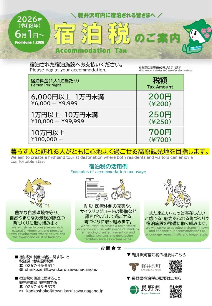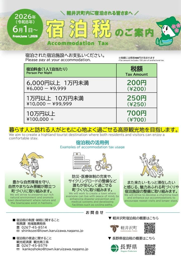 ตั้งแต่เดือนมิถุนายน 2026 เป็นต้นไป ตามข้อบัญญัติของจังหวัดนากาโนะและเมืองคารุอิซาวะ ทางที่พักจะเรียกเก็บภาษีที่พักจากผู้เข้าพักทุกท่านในขณะเช็คอิน