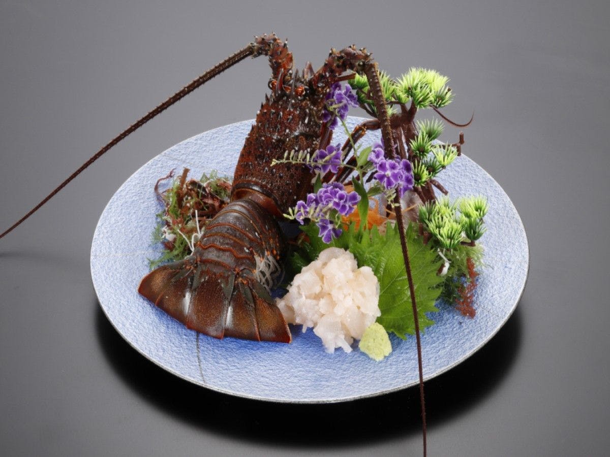 ซาชิมิปลาท้องถิ่น, หอยเป๋าฮื้อ, เนื้อวัวชิตะ พร้อมด้วยซาชิมิกุ้งมังกรสดและซุปกุ้งมังกร เป็นชุดอาหารค่ำระดับสูงสุดของเรา "โจ"