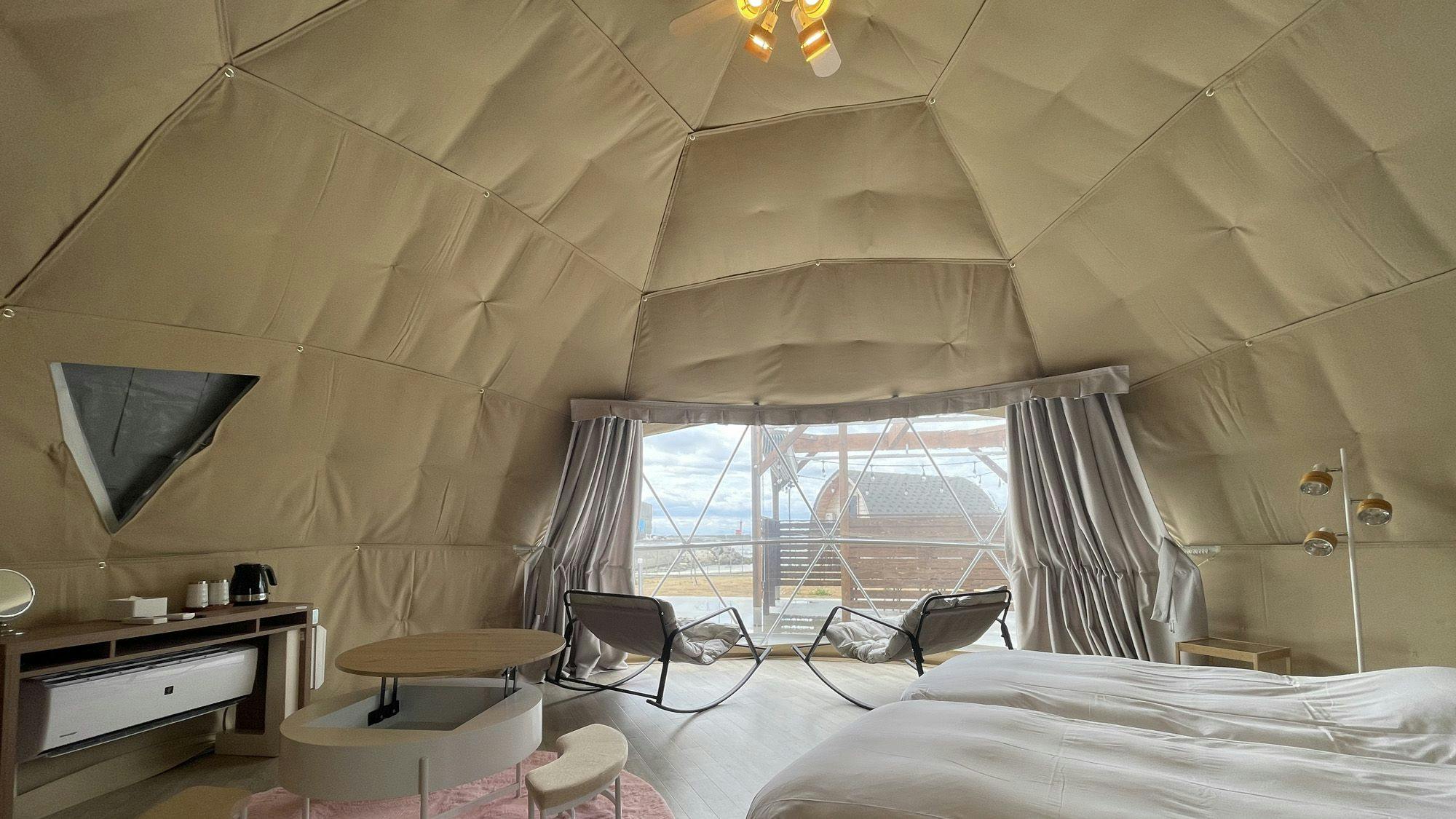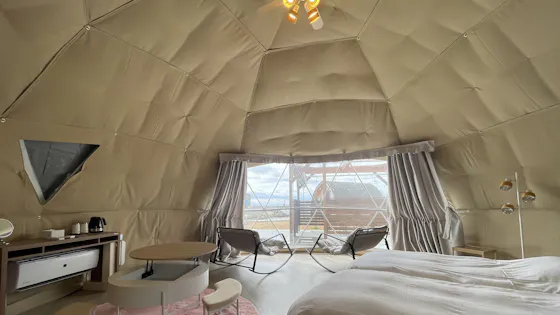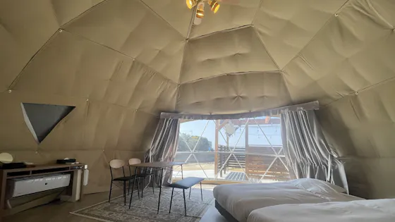 รีสอร์ท Eight Point Awaji Island ที่ตั้งอยู่ริมชายฝั่งทะเล เป็นสถานที่ที่เหมาะสมที่สุดสำหรับการพักผ่อนที่หรูหราและกลมกลืนกับธรรมชาติ ล้อมรอบด้วยธรรมชาติที่อุดมสมบูรณ์และเสียงคลื่นทะเล ช่วยให้คุณลืมความวุ่นวายในเมืองและผ่อนคลายได้อย่างเต็มที่ เต็นท์โดมที่กว้างขวางเหมาะสำหรับการใช้เวลาร่วมกับครอบครัวหรือคนสำคัญของคุณ กิจกรรมต่าง ๆ มีให้เลือกมากมาย เช่น การก่อกองไฟส่วนตัว ซาวน่าในเต็นท์ "โมลค์" และ "บีนแบ็คทอส" สำหรับมื้อเย็น คุณสามารถเลือกคอร์ส BBQ ที่ใช้เนื้อวัวอาวาจิ คอร์สสุกี้ยากี้ หรือแม้กระทั่งนำวัตถุดิบมา BBQ เองก็ได้