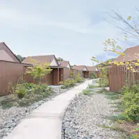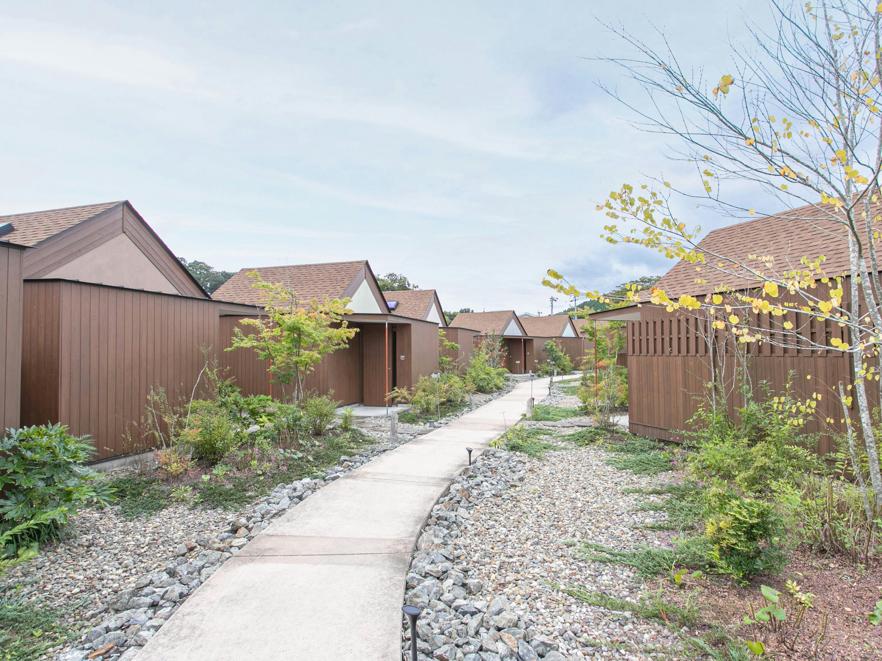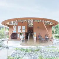 สถาปัตยกรรมไม้ของ Shigeru Ban และบ่อน้ำเดินที่สามารถใส่ชุดว่ายน้ำได้เป็นจุดเด่น