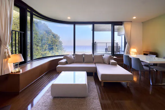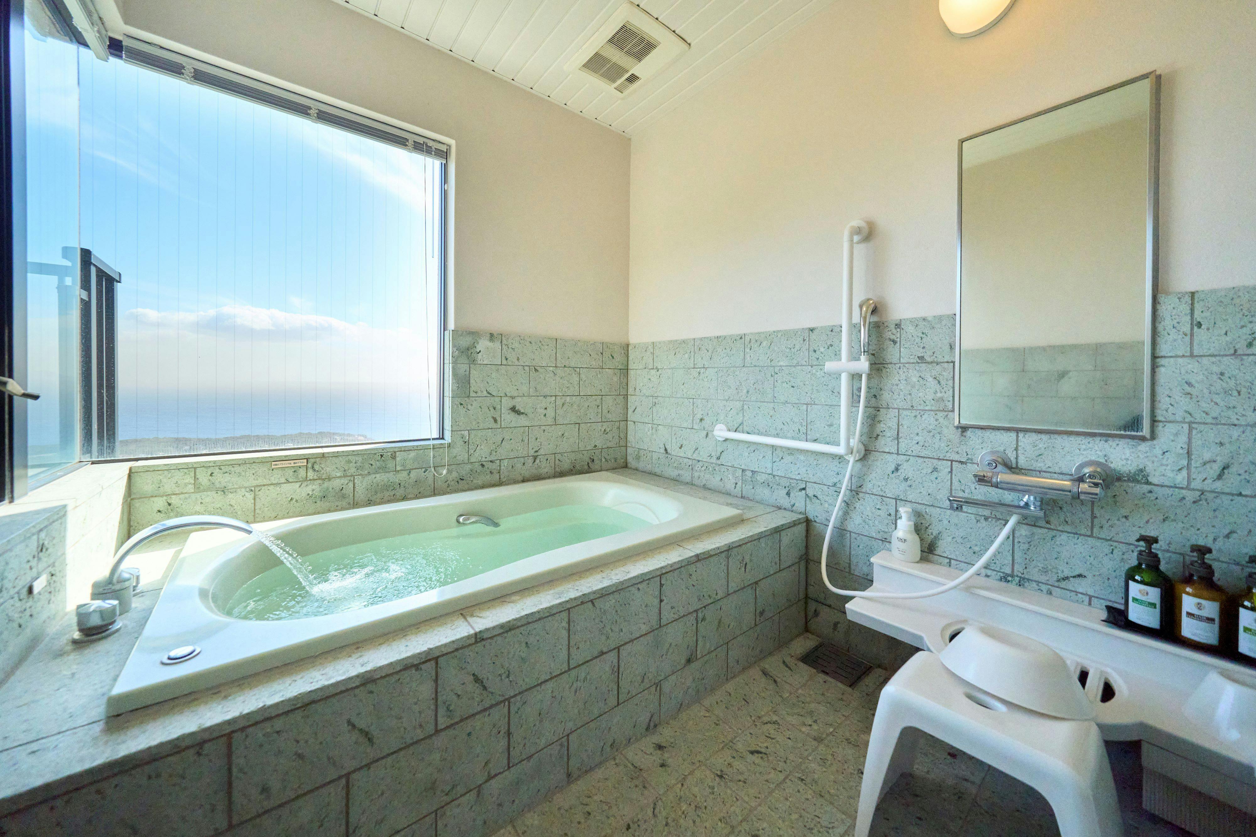 อ่าวซางามิที่กว้างใหญ่และเกาะอิซุโอชิมะที่ลอยอยู่ในมหาสมุทรกว้างใหญ่ ตั้งแต่ก้าวเข้าสู่ห้องนั่งเล่น คุณสามารถเพลิดเพลินกับพาโนรามาของมหาสมุทรที่ไม่สามารถสัมผัสได้ในชีวิตประจำวันผ่านหน้าต่างโค้ง ในห้องอาบน้ำที่มีวิวสวยงามซึ่งทำจากกระจกทั้งหมดด้านทะเล คุณสามารถเพลิดเพลินกับน้ำพุร้อนที่มีประโยชน์ได้ตลอด 24 ชั่วโมง ผ่อนคลายในน้ำพุร้อนและฟื้นฟูความเหนื่อยล้าจากชีวิตประจำวัน