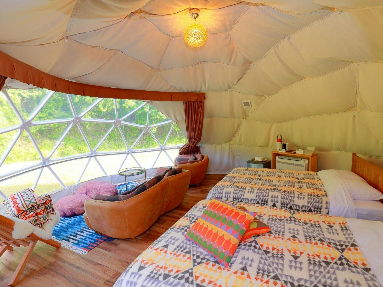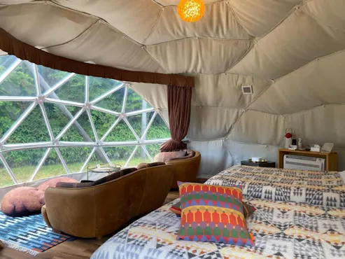 After looking around because I wanted to try glamping in a dome tent, I chose this place because it was the most affordable.The dome tent interior was all so cute, and the bed was super fluffy—I slept much better than at many Hotels.The free drinks were a big hit with the kids, the management building was close and very convenient, and both the toilets and showers were extremely clean. Is this a new campsite?We went on April 4; it was warm enough to play in short sleeves during the day, but at night it got so cold you could see your breath, so please be careful...We only rented a stove and did a BBQ, but it came with wind-blocking side sheets, so we barely felt cold—this was amazing.The light was dim and we couldn’t tell by color whether the meat was cooked, so bringing your own light might be a good idea.