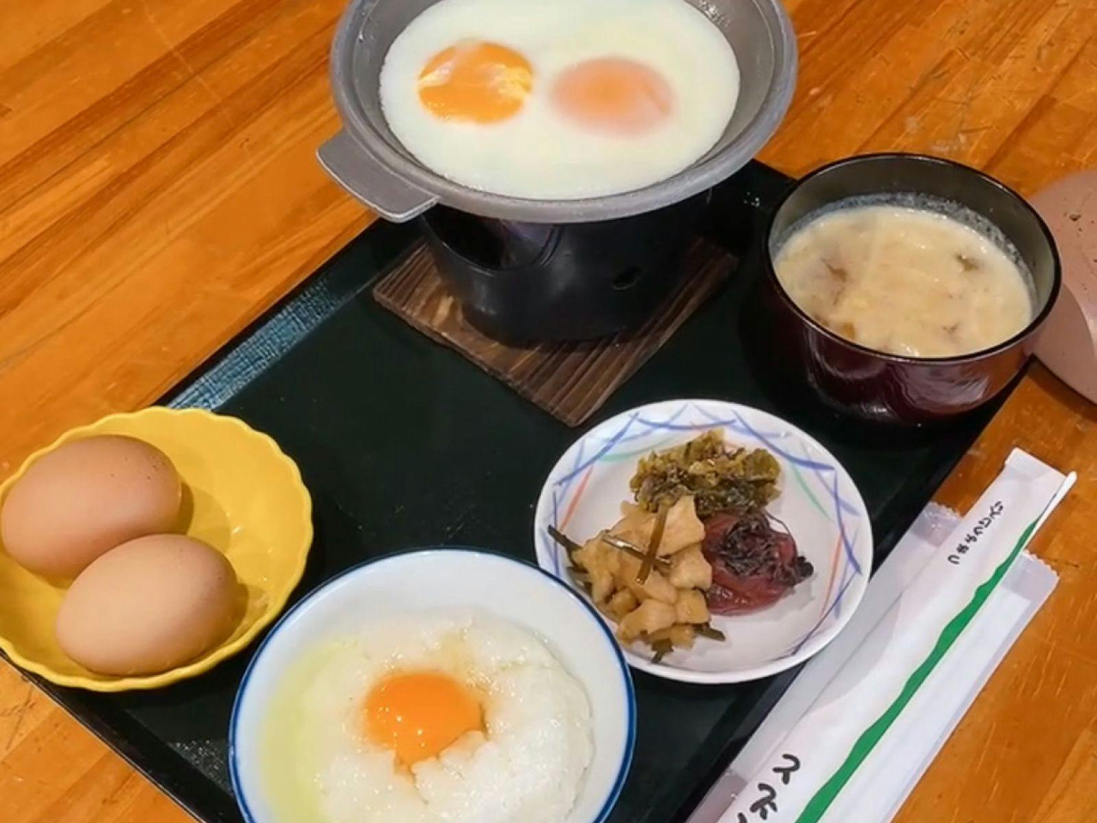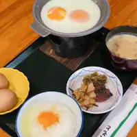 1: ไข่สดใหม่จากฟาร์มไก่ท้องถิ่นที่สามารถรับประทานได้ไม่อั้น 2: <สลัดบาร์> ผักสดใหม่จากยามากะที่สามารถรับประทานได้อย่างเต็มที่ 3: <เครื่องเคียง> รสชาติแบบบ้านๆ เช่น โกโบคินปิระและฮิจิกินิมุโนะ 4: รวมเครื่องดื่ม (ชา, กาแฟ, น้ำส้ม ฯลฯ) 5: ข้าวอร่อยผลิตในท้องถิ่น และซุปมิโสะที่ใช้ถั่วเหลืองจากจังหวัดคุมาโมโตะ