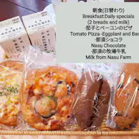 | อาหารเช้า | อาหารเช้าจะเป็นขนมปัง 2 ชนิดที่คัดสรรจากวัตถุดิบท้องถิ่นของนาสุซึ่งอุดมด้วยธรรมชาติ พร้อมนมสดจากฟาร์ม โดยจะจัดส่งแบบรูมเซอร์วิส (ไม่พบหน้า) ใส่ในกล่องเฉพาะหน้าห้องพัก (หมายเหตุ) ชนิดของขนมปังเป็นแบบสุ่มเปลี่ยนทุกวัน ขนมปังทำมือทีละชิ้นตั้งแต่การเตรียมแป้ง ไม่ใช้สารเร่งยีสต์ สารอิมัลซิไฟเออร์ สารปรับปรุงคุณภาพแป้ง หรืออาหารที่มีไขมันทรานส์สูง จึงรับประทานได้อย่างมั่นใจ *สำหรับแผนพร้อมอาหารเช้าเท่านั้น |