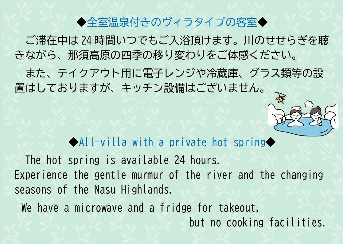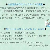 เราหวังเป็นอย่างยิ่งว่าการเข้าพักท่ามกลางธรรมชาติอันอุดมสมบูรณ์ของที่ราบสูงนาสุ จะช่วยเติมเต็มความสุข ความผ่อนคลาย และรอยยิ้มให้กับชีวิตประจำวันของท่าน วิลล่าทั้ง 5 หลังมีน้ำพุร้อนกลางแจ้งในทุกห้องพัก ท่านสามารถสัมผัสการเปลี่ยนแปลงของฤดูกาลที่ราบสูงนาสุ เช่น ใบไม้ผลิ ดอกซากุระ หิ่งห้อย ใบไม้เปลี่ยนสี และทิวทัศน์ฤดูหนาว นอกจากนี้ยังมีลำธารใสไหลผ่านหน้าห้องพักทุกห้อง ท่านสามารถเพลิดเพลินกับการแช่น้ำพุร้อนพร้อมฟังเสียงน้ำไหลอย่างสบายใจ น้ำพุร้อนคุณภาพดีจากนาสุถูกส่งตรงถึงห้องพักของท่าน ท่านสามารถเพลิดเพลินกับการแช่น้ำได้ในเวลาที่ท่านต้องการโดยไม่มีใครรบกวน (หิ่งห้อยในช่วงเดือนมิถุนายนถึงกรกฎาคมขึ้นอยู่กับสภาพอากาศในวันนั้น) ภายในห้องพักตกแต่งด้วยบรรยากาศที่เงียบสงบและประดับด้วยของตกแต่งแอนทีคแบบตะวันตก ท่านสามารถเพลิดเพลินกับช่วงเวลาแห่งการเดินทางได้อย่างเต็มที่ ที่ห้องอาหาร เราให้บริการอาหารที่ปรุงจากวัตถุดิบท้องถิ่นที่ได้รับการดูแลจากสภาพภูมิอากาศและธรรมชาติของนาสุ โปรดเพลิดเพลินกับอาหารรสเลิศที่มีทั้งความงดงามของการจัดจานและรสชาติที่ลึกซึ้ง พร้อมสร้างความทรงจำพิเศษในช่วงเวลานั้น นอกจากนี้ บริเวณรอบๆ ที่พักของเราซึ่งตั้งอยู่ใจกลางที่ราบสูงนาสุ ยังมีสิ่งอำนวยความสะดวกด้านการท่องเที่ยวและร้านอาหารที่เป็นตัวแทนของนาสุมากมาย เราหวังว่าท่านจะใช้ที่พักของเราเป็นจุดเริ่มต้นสำหรับการท่องเที่ยวนาสุได้อย่างสะดวกสบาย