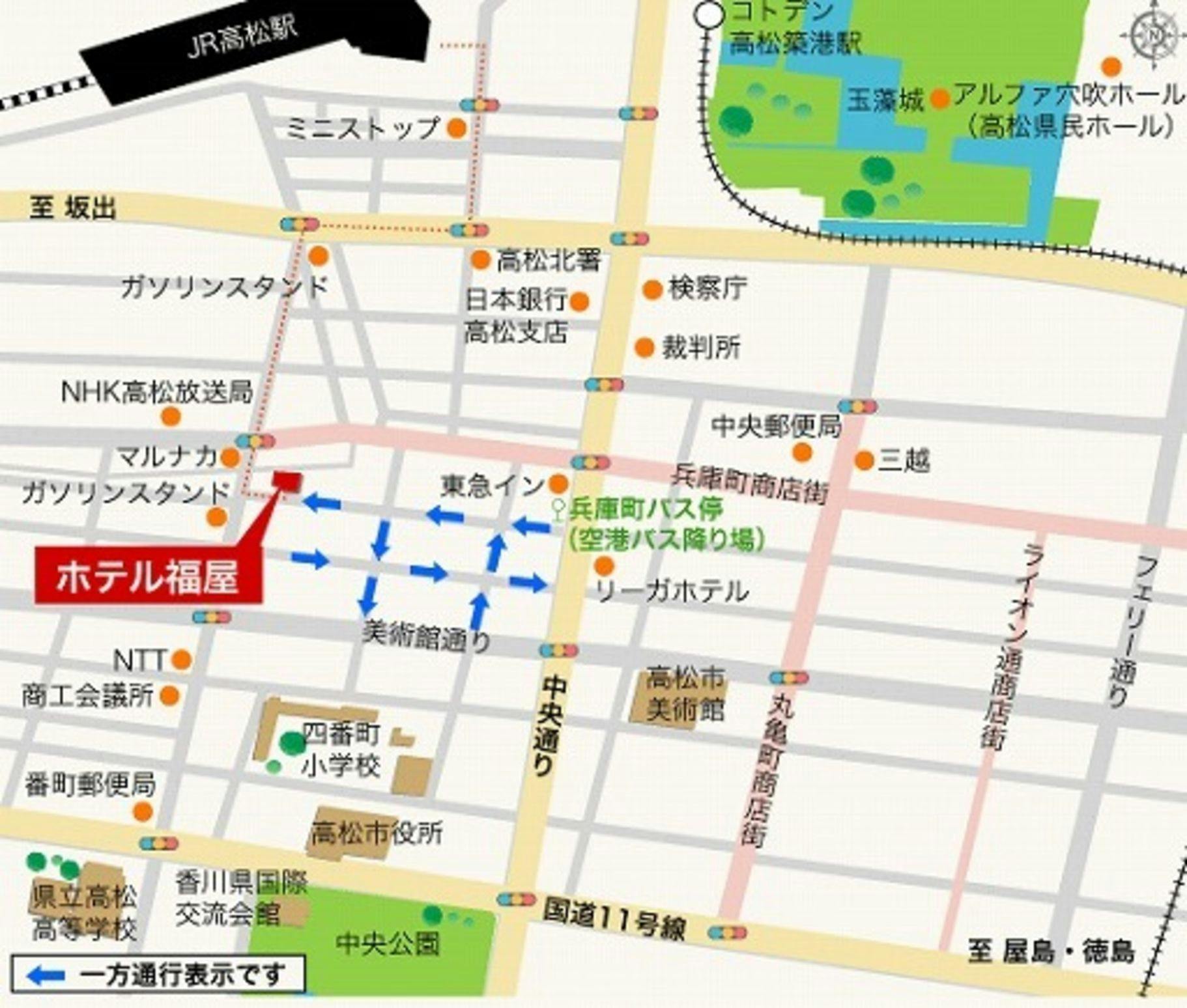 จากสถานี JR Takamatsu 490 เมตร (เดิน 8 นาที) ลงรถบัสสนามบินที่ Hyogocho เข้าถนนกลางทางใต้ของถนนช้อปปิ้ง Hyogocho เลี้ยวเข้าถนนก่อนถึงหน้าสำนักงานจังหวัด 15 เมตร