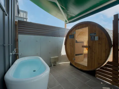 ห้องพักทั้ง 5 หลังมีซาวน่าบาร์เรลติดตั้งไว้ ซาวน่ารูปทรงถังไม้ที่ให้ความอบอุ่นแก่ร่างกายด้วยอากาศร้อนที่ไหลลงมาตามเพดานโค้ง พร้อมด้วยบ่อน้ำเย็นและเด็คสำหรับพักผ่อนกลางแจ้ง ให้คุณเพลิดเพลินกับซาวน่าที่ออกแบบมาอย่างพิถีพิถัน ท่ามกลางทิวทัศน์ทะเลและธรรมชาติที่งดงาม ※กรุณาสวมชุดว่ายน้ำหรือเสื้อผ้าที่เหมาะสมเมื่อใช้ซาวน่าและอ่างน้ำกลางแจ้ง