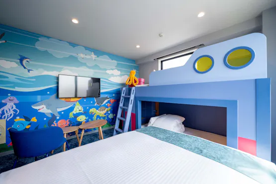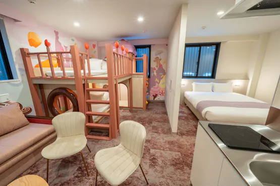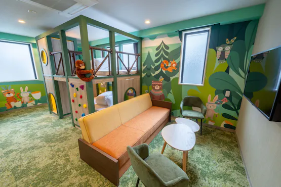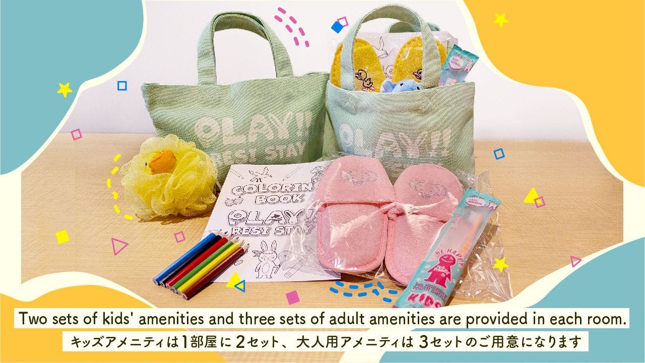 “PLAY!! RESI STAY” คือที่พักที่ทำให้เผลออุทานว่า “ว้าว!” เด็ก ๆ สามารถสนุกได้อย่างเต็มที่ เพื่อสร้างพื้นที่ที่เด็ก ๆ หลงใหล เราจัดเตรียมห้องพัก 3 แบบในธีม ป่า ทะเล และขนมหวาน แต่ละห้องมีเตียงสองชั้นราวกับ “ฐานลับ” พร้อมลูกเล่นมากมายที่กระตุ้นความอยากรู้อยากเห็นของเด็ก ๆ นอกจากนี้ บริเวณล็อบบี้และทางเดินยังมีเกมโปรเจกชันและผนังปีนหน้าผา (โบลเดอริง) ให้เล่นได้อย่างเต็มที่แม้อยู่นอกห้องพัก! “ห้องธีมป่า” และ “ห้องธีมขนมหวาน” มาพร้อมครัว สามารถเตรียมอาหารเด็กหรือทำอาหารเช้าได้ จึงสบายใจแม้พาเบบี้มาด้วย อีกทั้งพื้นที่ส่วนกลางมีเครื่องซักผ้าหยอดเหรียญ ต่อให้เสื้อผ้าเปื้อนก็ไม่ต้องกังวล