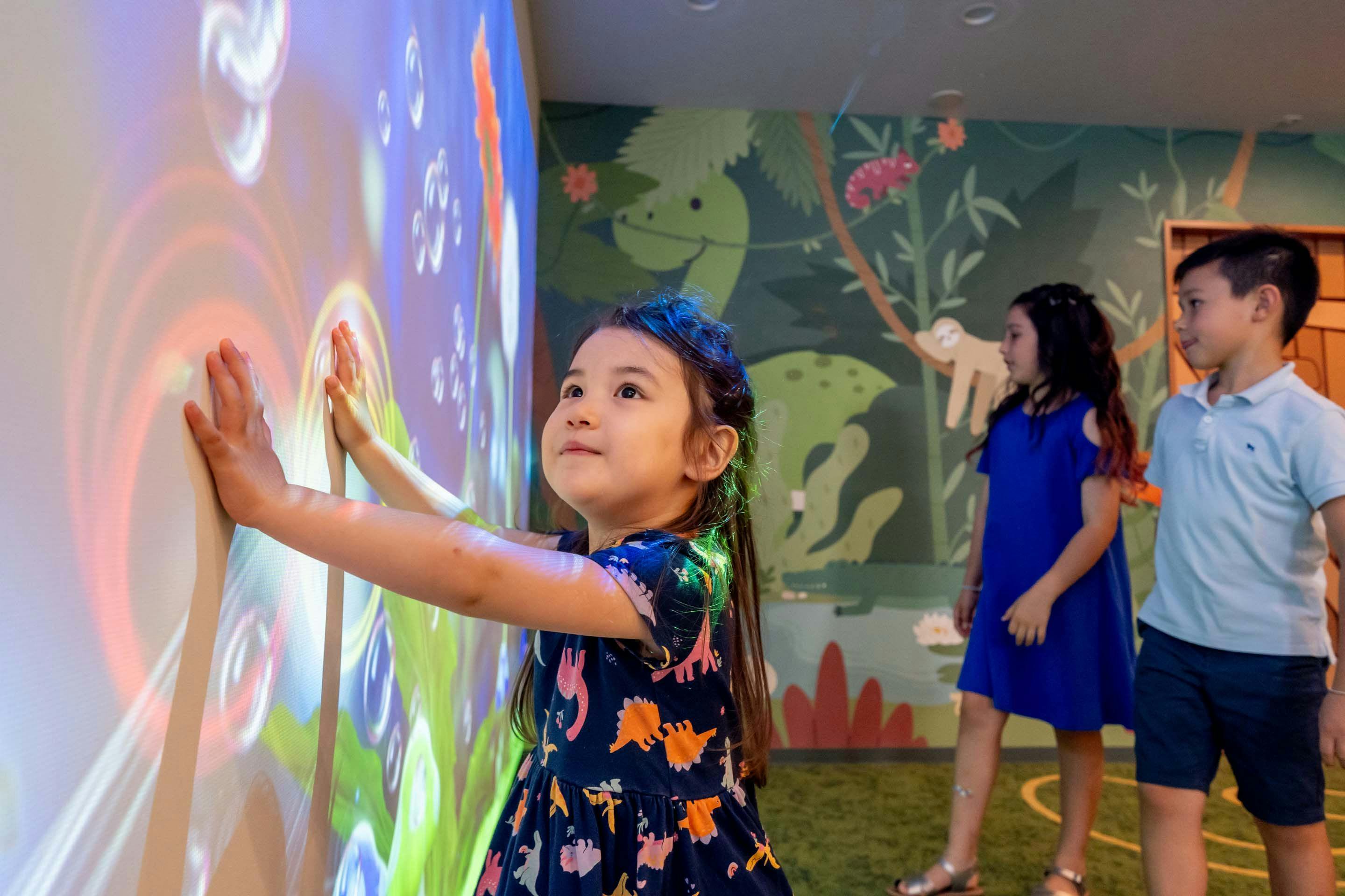 นอกห้องพัก เราได้เพิ่มพื้นที่ให้เด็กๆ สนุกได้อย่างเต็มที่ เมื่อก้าวเข้าสู่ทางเข้า จะพบเกมโปรเจกชันที่ฉายเต็มผนังด้วยภาพสีสันสดใสต้อนรับคุณ เพียงแตะฟองสบู่ ก็จะมีนางฟ้าปรากฏพร้อมดอกไม้บาน เป็นลูกเล่นที่สนุกสนาน นอกจากนี้ ภายในชั้นยังมีผนังปีนหน้าผาสำหรับเด็กๆ ติดตั้งไว้ด้วย อีกทั้งยังมีมุมกระโดดช่อง (ฮอปสก็อต) และสไลเดอร์ รวมถึงพื้นที่เล่นอีกมากมาย ให้เด็กๆ เล่นได้เพลินไม่มีเบื่อ